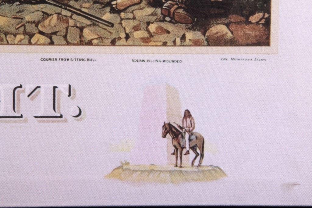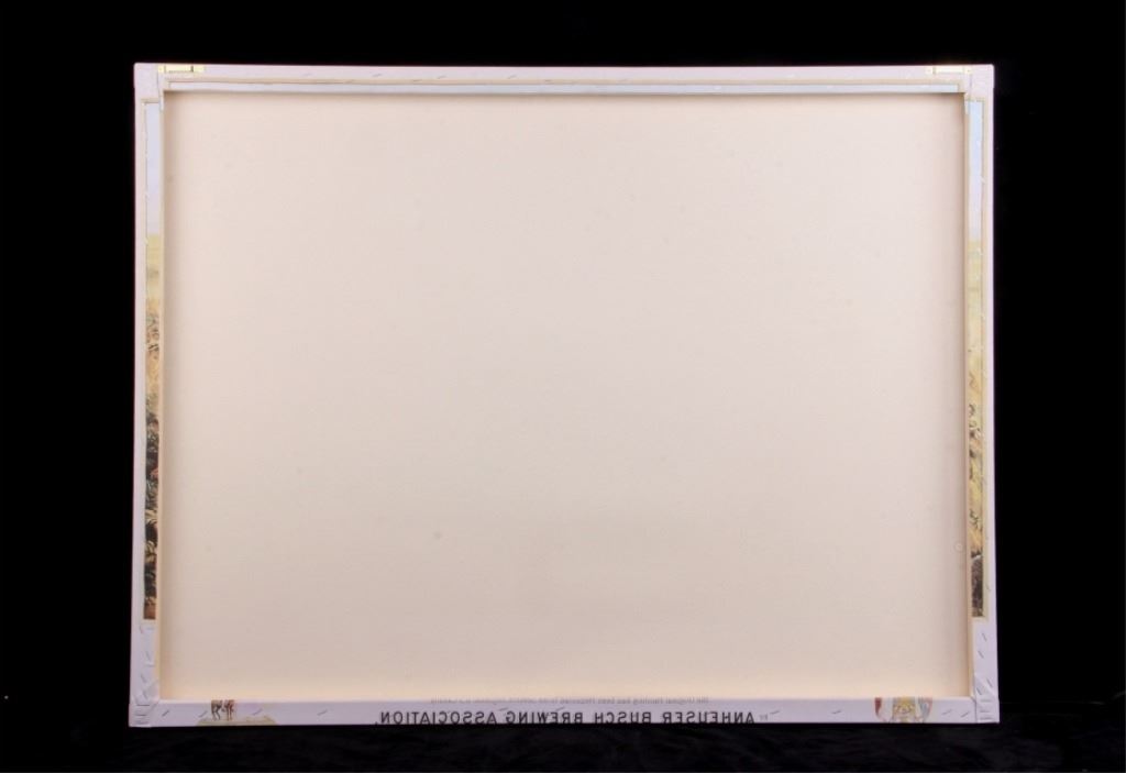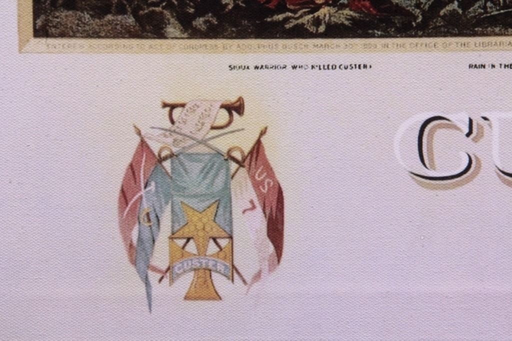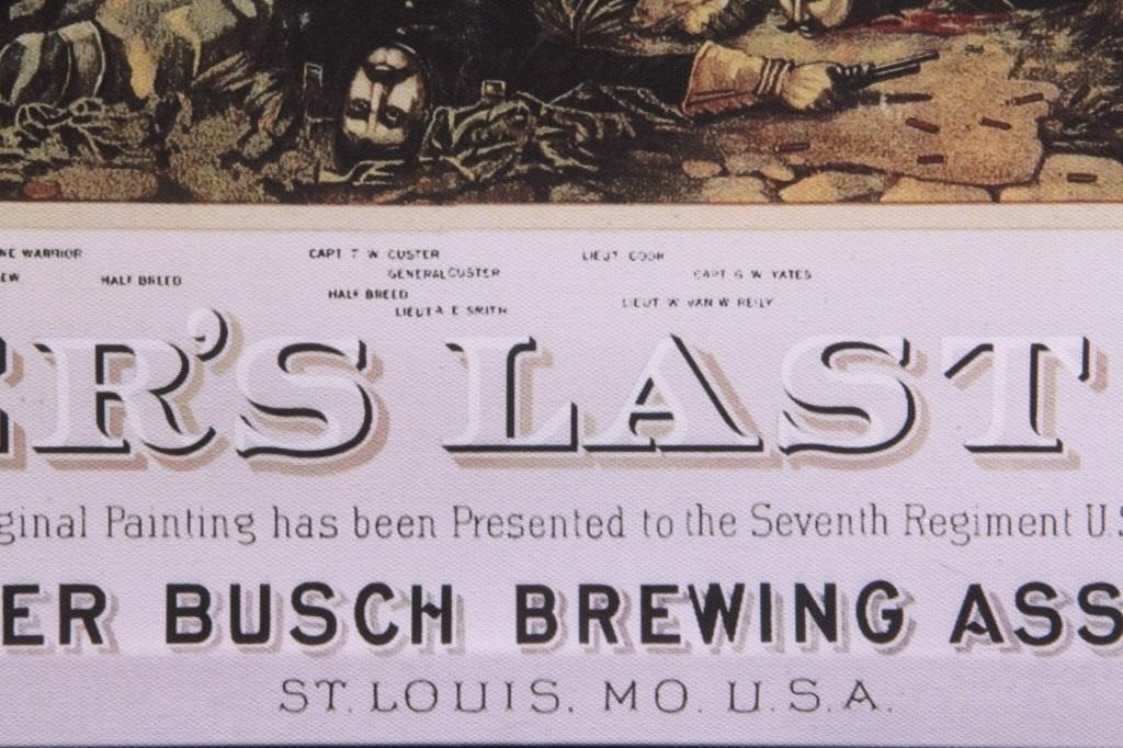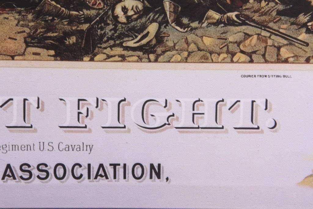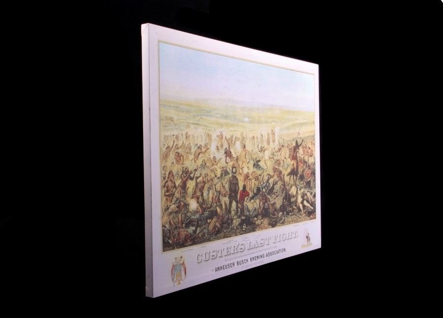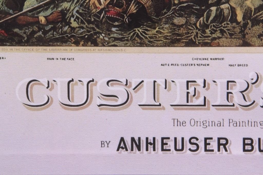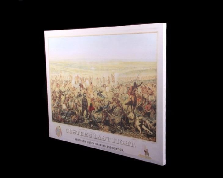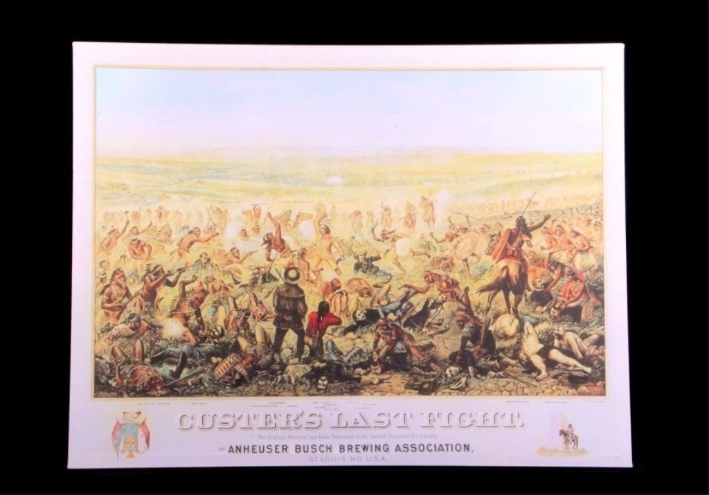 This lot includes a chromolithograph of “Custer’s Last Fight” by Anheuser Busch. This chromolithograph on canvas is based on the Cassilly Adams painting that was inspired by the narrative of the battle by a scout named Curley. The original painting by Adams was completed in 1888 and sold to John Ferber, who owned a saloon in St Louis, Missouri. This was used as an advertisement for Busch for many years. This chromolithograph measures 42” by 32”.