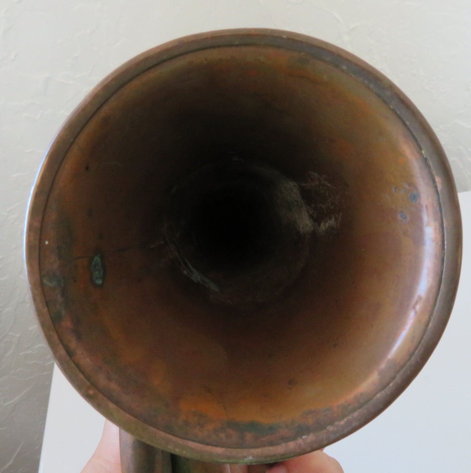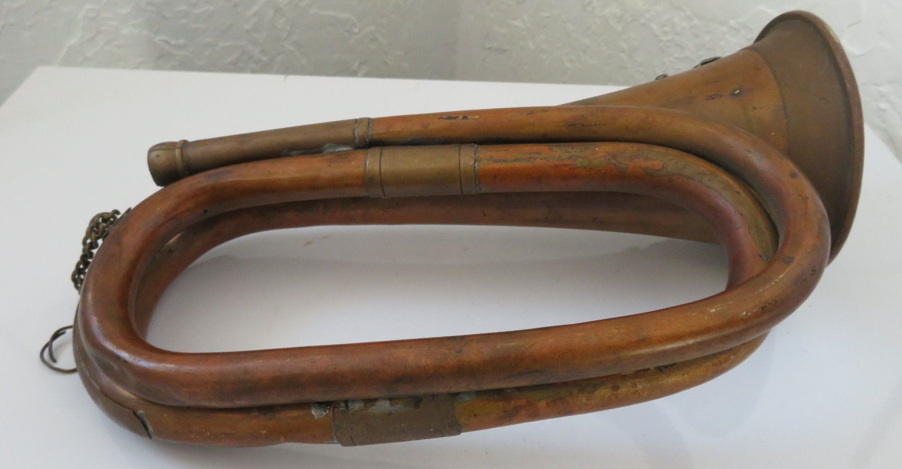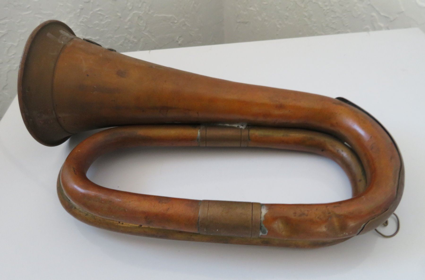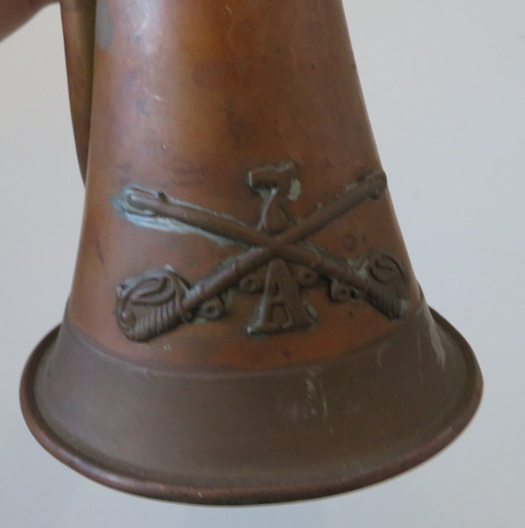 "Custer's Last Stand" Trumpet, c. 1850s-80s. Made of brass, the item measures 4" x 11". United States. Cavalry trumpet with excellent signs of wear, A/7 cross swords. Condition: Good, mouthpiece missing, see images. Shipping: $30.00 w/insurance and signature, see images.
