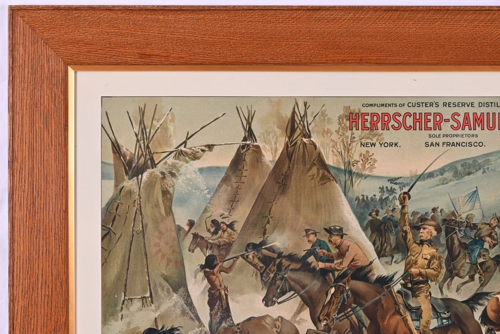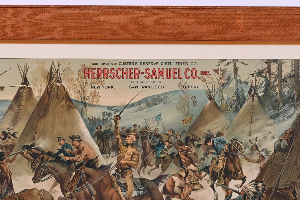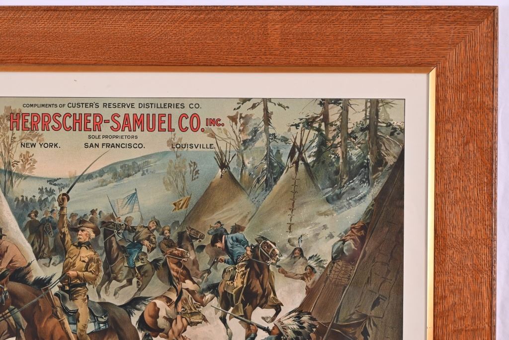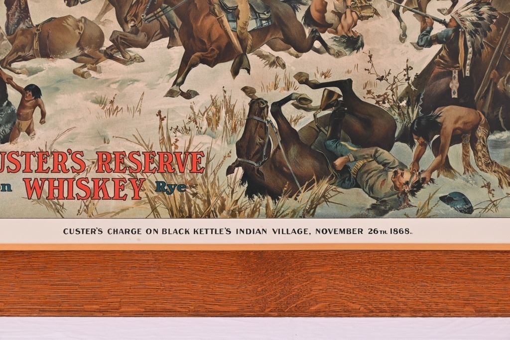 Extremely rare Oak-framed paper sign advertisement "Custer's Charge On Black Kettle's Indian Village, November 26th, 1868." Compliments of Custer's Reserve Distilleries Co., Herrscher-Samuel Co. Inc., New York, San Francisco, Louisville. Excellent original condition, over 125 years old. Oak frame measures 34.5" x 48.5"