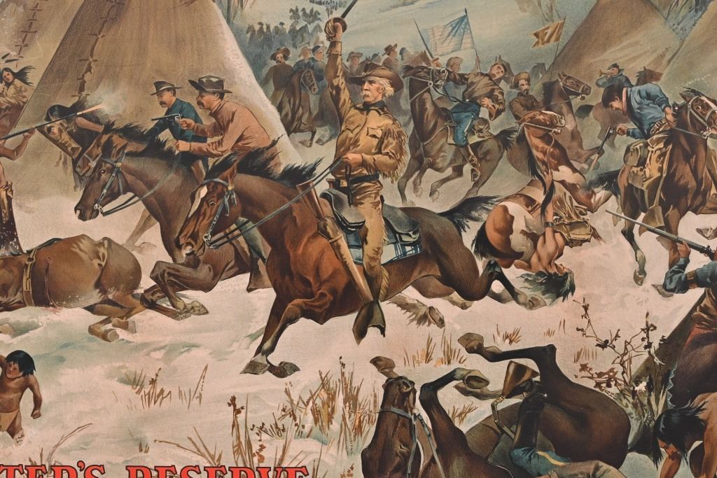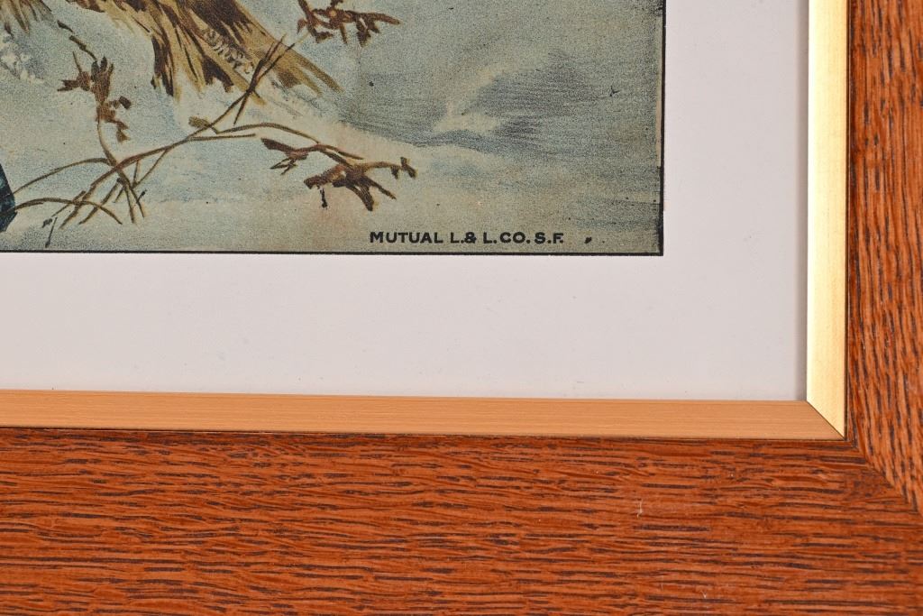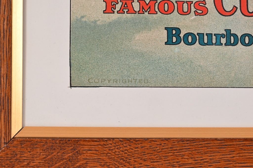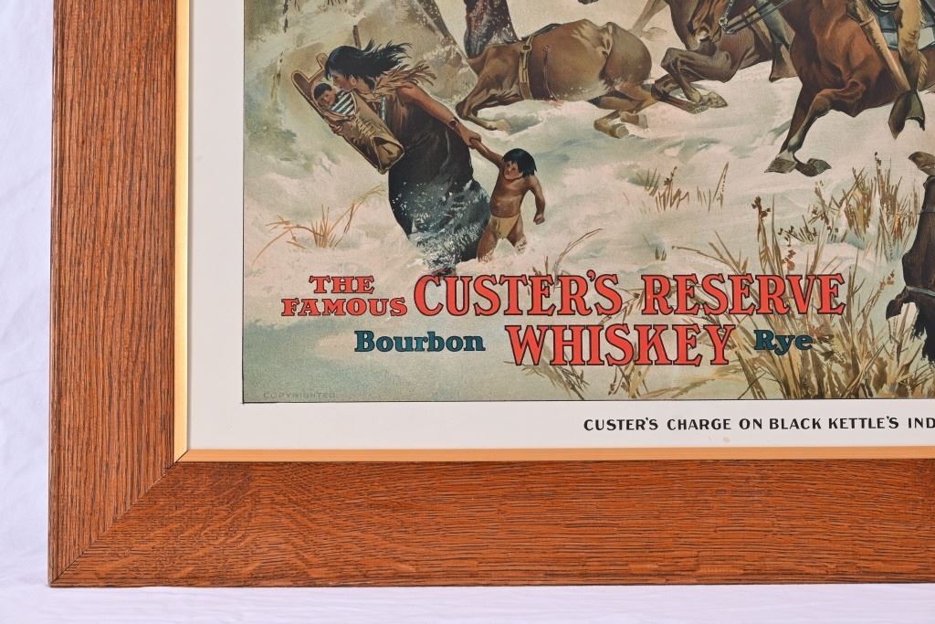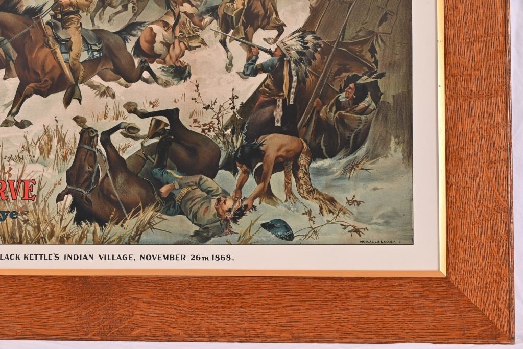 Extremely rare Oak-framed paper sign advertisement "Custer's Charge On Black Kettle's Indian Village, November 26th, 1868." Compliments of Custer's Reserve Distilleries Co., Herrscher-Samuel Co. Inc., New York, San Francisco, Louisville. Excellent original condition, over 125 years old. Oak frame measures 34.5" x 48.5"