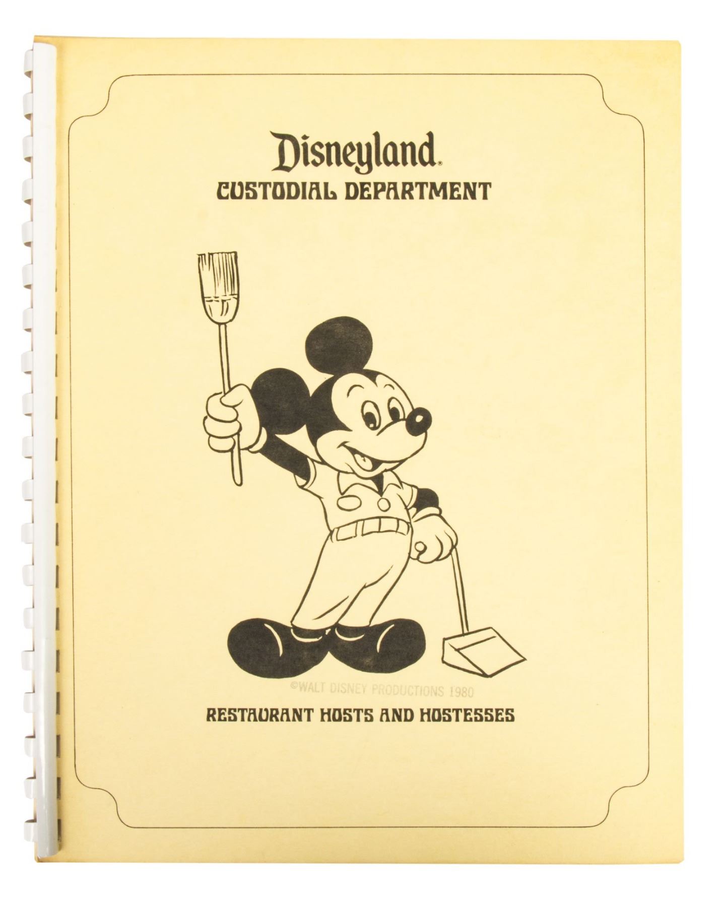 (Disneyland, 1980) An internal booklet created for new hire Hosts and Hostesses within Disneyland's Custodial Department. The booklet contains general operating procedures, closing procedures, bussing utility, costume requirements, and more. Measuring 11"x8.75", the booklet is in very good condition with minor surface-wear. The cover and first interior page are stamped "Walt Disney Productions 1980".