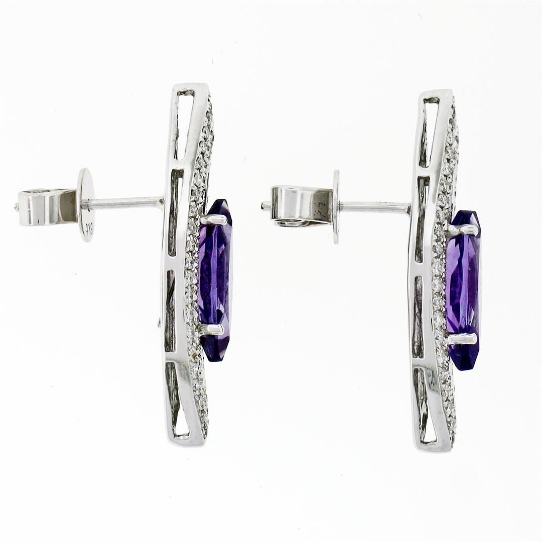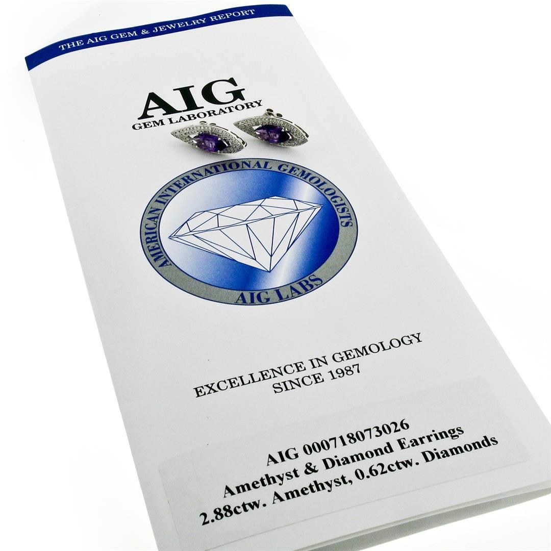 An estate solid 18k white gold stud earrings, AIG certified 2 marquise cut natural amethyst (2.88ctw), and 148 round brilliant cut natural diamonds (H/I - VS2/SI2 ; 0.62ctw). The earrings measure approximately 27.11x9.32mm and weigh a total of 6.17 grams. Comes with all original relevant certifications.