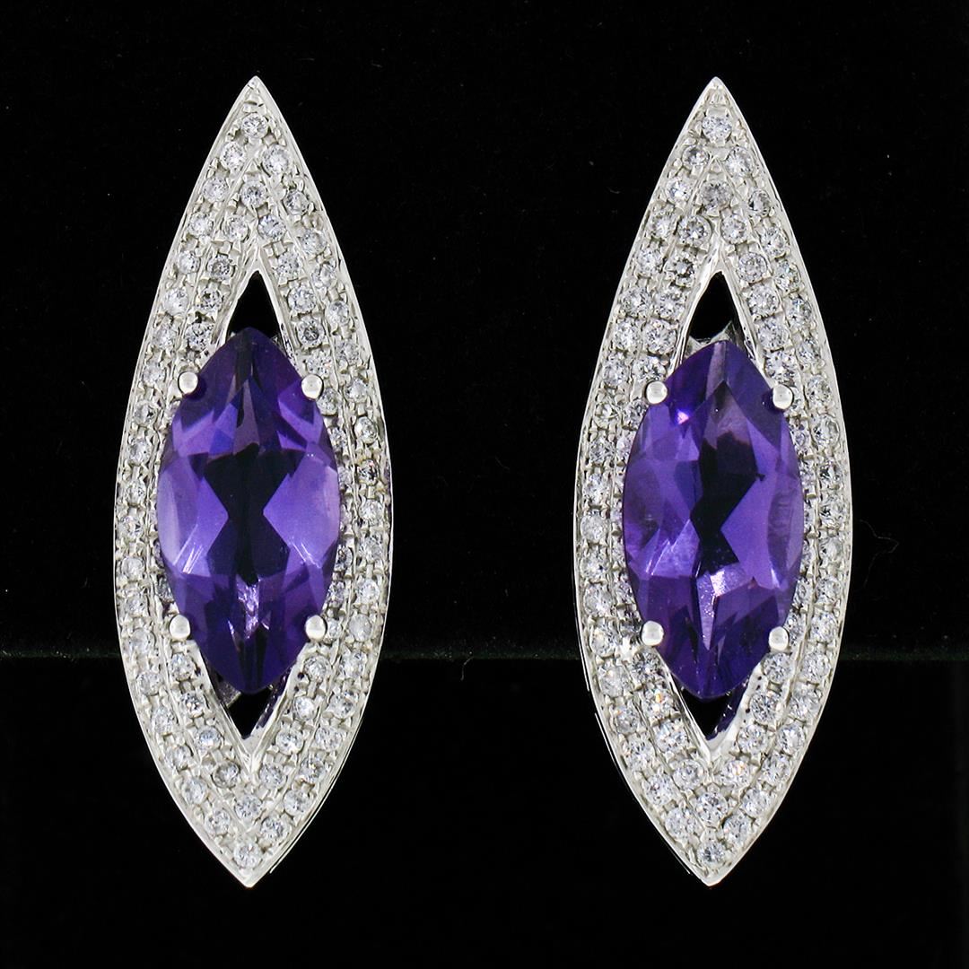 An estate solid 18k white gold stud earrings, AIG certified 2 marquise cut natural amethyst (2.88ctw), and 148 round brilliant cut natural diamonds (H/I - VS2/SI2 ; 0.62ctw). The earrings measure approximately 27.11x9.32mm and weigh a total of 6.17 grams. Comes with all original relevant certifications.