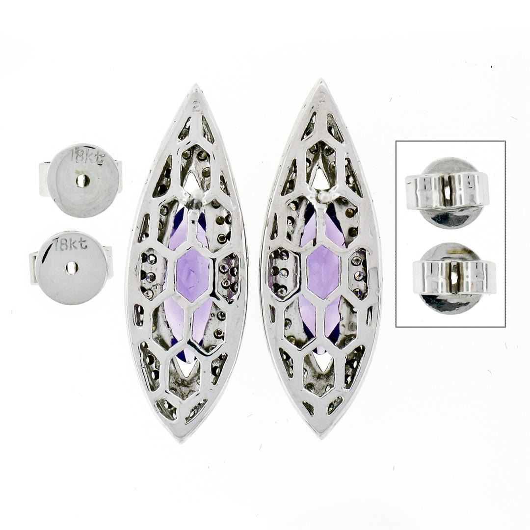 An estate solid 18k white gold stud earrings, AIG certified 2 marquise cut natural amethyst (2.88ctw), and 148 round brilliant cut natural diamonds (H/I - VS2/SI2 ; 0.62ctw). The earrings measure approximately 27.11x9.32mm and weigh a total of 6.17 grams. Comes with all original relevant certifications.