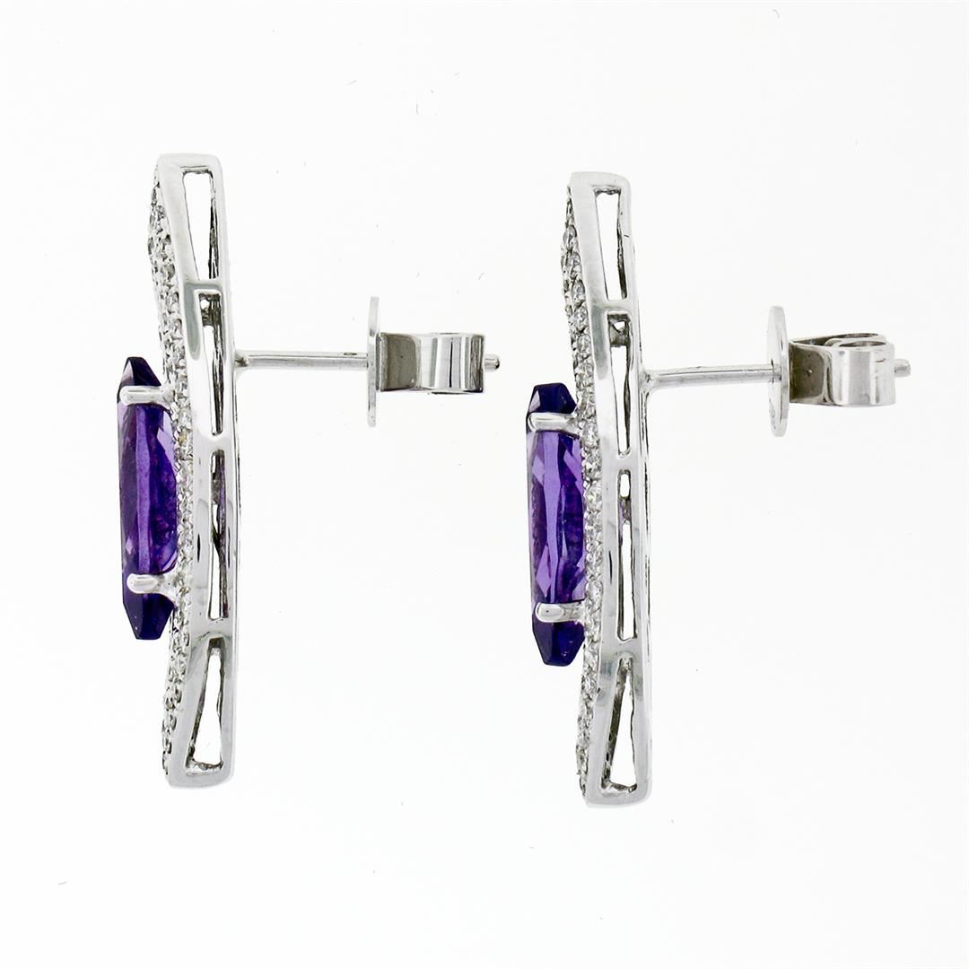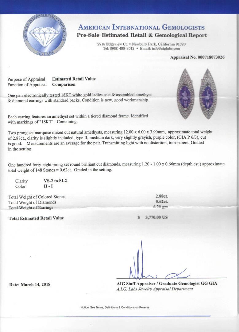 An estate solid 18k white gold stud earrings, AIG certified 2 marquise cut natural amethyst (2.88ctw), and 148 round brilliant cut natural diamonds (H/I - VS2/SI2 ; 0.62ctw). The earrings measure approximately 27.11x9.32mm and weigh a total of 6.17 grams. Comes with all original relevant certifications.
