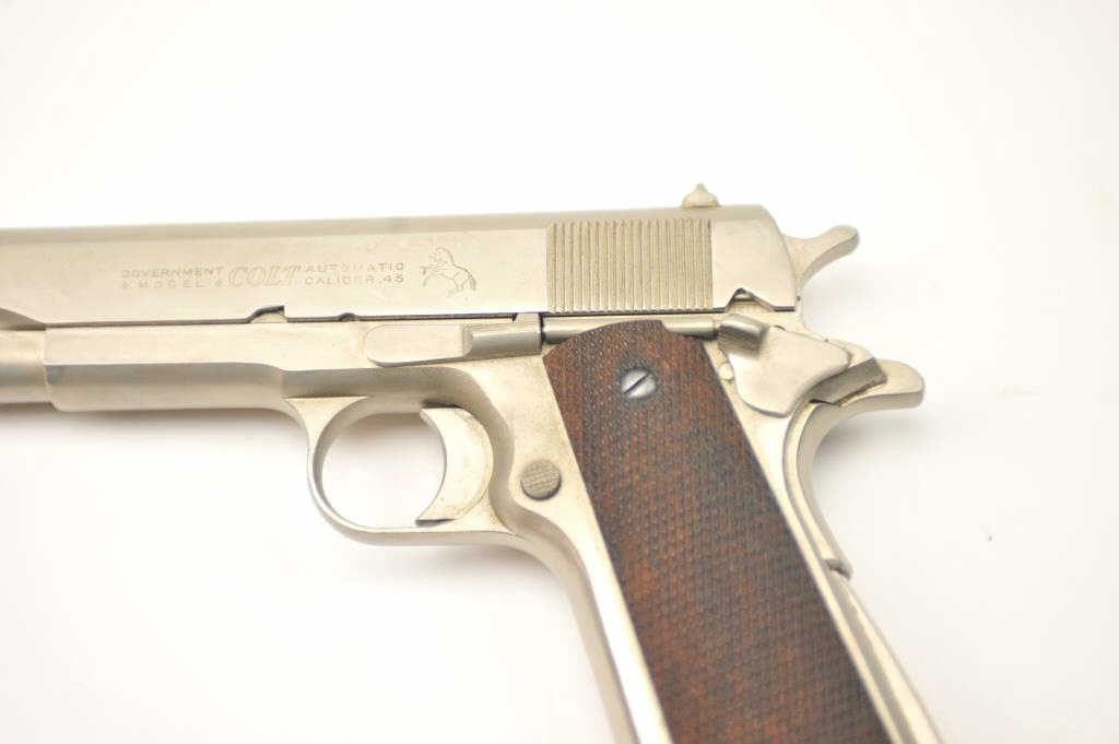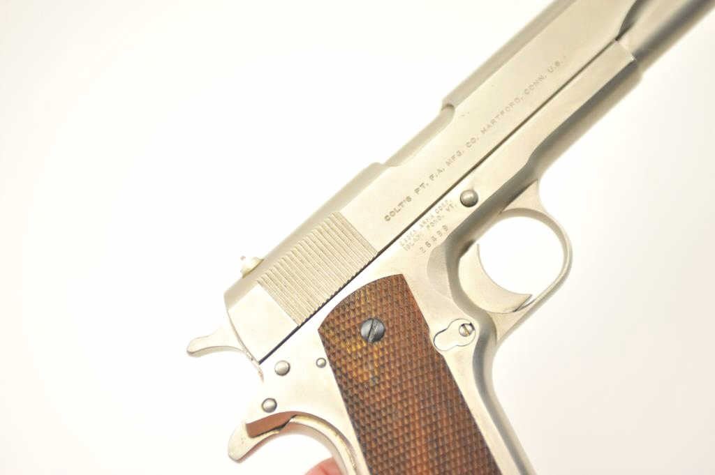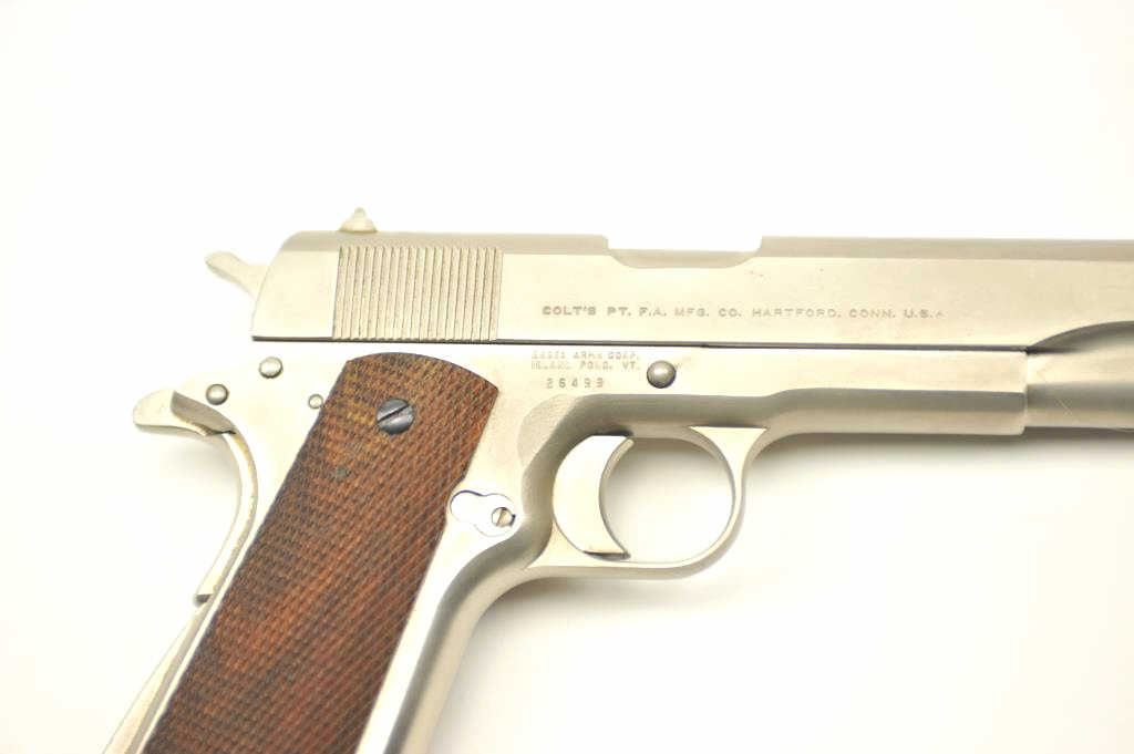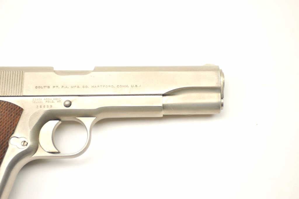 Custom 1911A1 Semi-Auto Pistol in .45 ACP caliber showing Colt Government model slide on Essex steel frame, S/N 26499. Hard chrome or satin nickel finish and checkered wood grips. A good quality build up to factory ormilitary standards with commercial after market barrel and parts. Military type trigger pull. Very good plus with minor toning to finish that would polish or clean up. (Modern/PPT) Est.: $400-$800
