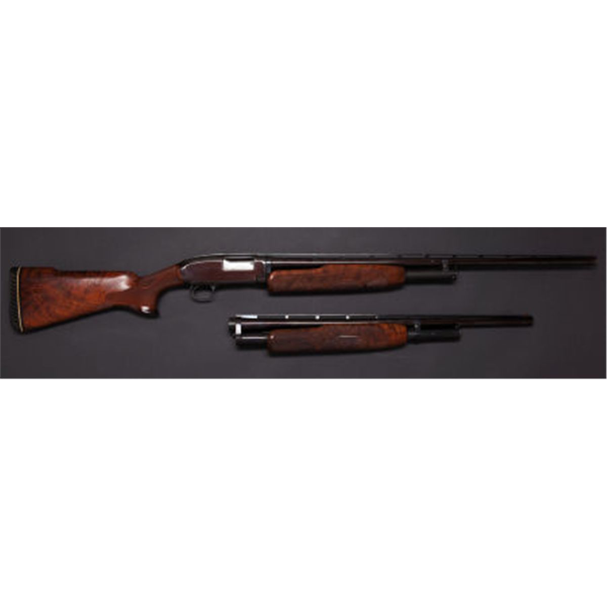 *Custom 20 Gauge Winchester Model 12 Slide Action Shotgun With Extra Barrel. Serial no. 189516. 20 gauge. 28 and 24 1/2 inch barrels each with fore-end. Both barrels are fitted with a later ventilated rib. Reblued slide action. Custom pistolgrip stock and enlarged fore-ends of highly figured walnut. Stock with a lowered comb and a swept rosewood grip cap. Ornate very fine checkering with banding and scalloped borders. Pachmayr recoil pad. Data: Chokes: 28-inch barrels: 0.024 inches.(Improved Modified), 24 inch barrels: 0.003 inches (Cylinder). Condition: Excellent as redone. Barrels and action show 99% reblued finish. Magazine tubes show show 80% bluing. 24 inch barrel shows a few very small spots of older pitting. Bores: 28 inch: Bright bore, 26 inch: Bore shows roughness and light pitting. Stock shows a 2 1/2 inch non structural shrinkage crack in butt. Wood shows a very few light marks.