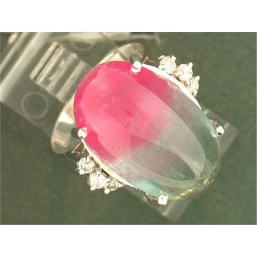 Simply fabulous ring! In the center is a stunning 21.95ct watermelon tourmaline. Superb cabachon cut and great color transition. This gem is accented by 0.35tcw of fine diamonds. These superior quality gems are set in a band of fine 14k white gold.