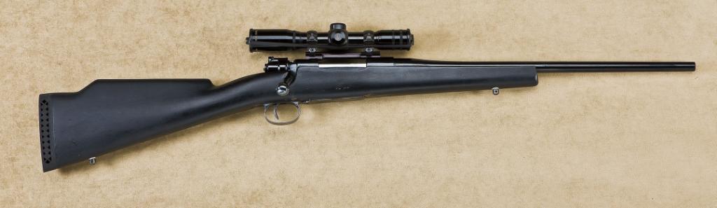 Custom 7x57 caliber bolt action sporting carbine on Mexican model 98 action, serial number “9156”. The carbine shows a McCowen barrel measuring approx. 18”, carbine measures 38-7/8” overall. The carbine shows a dark stained wood stock, high polished blue finish, Burris scope, and hard rubber recoil pad. The condition is fine to near excellent as reconditioned. Est.: $300-$500