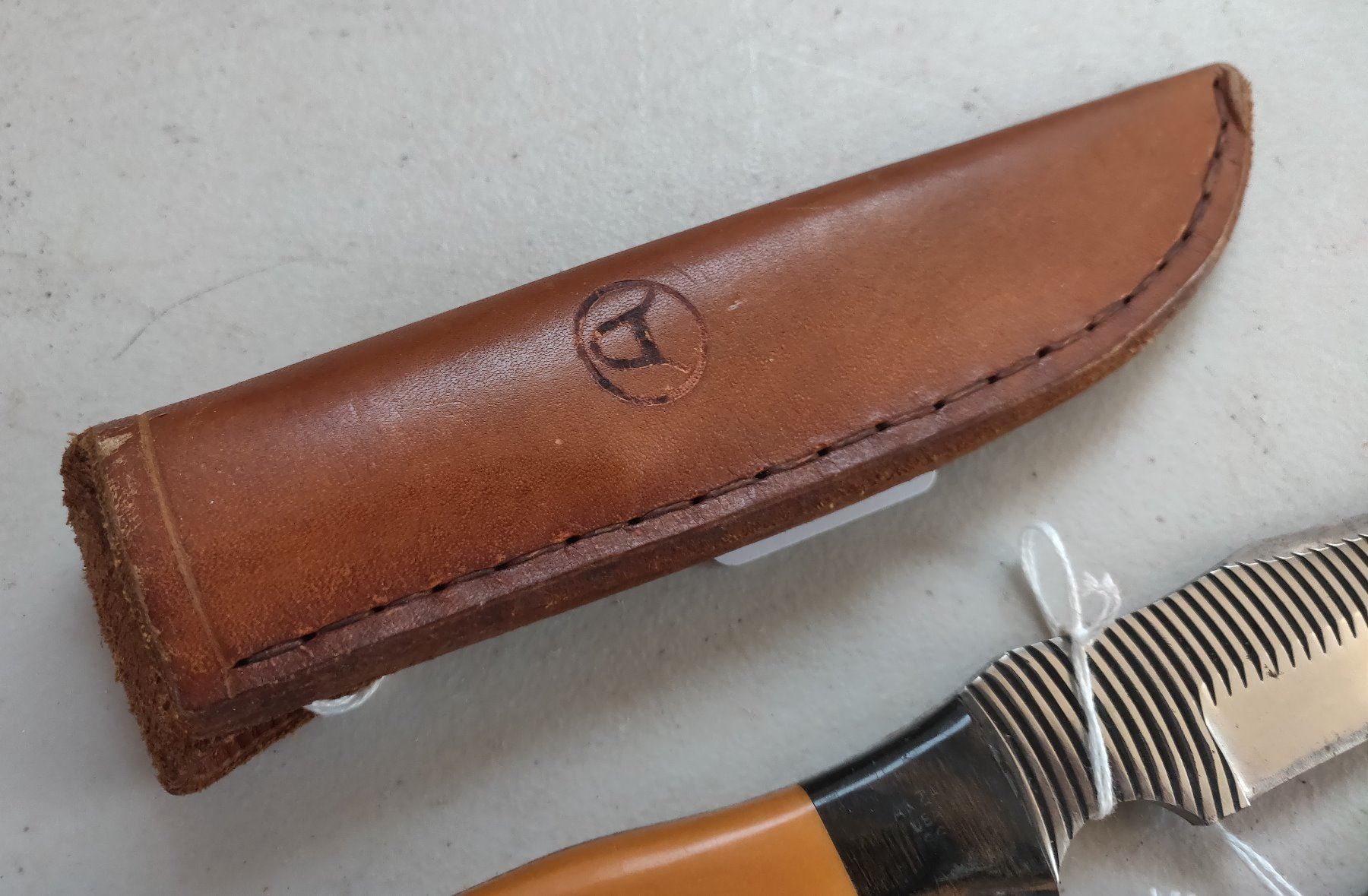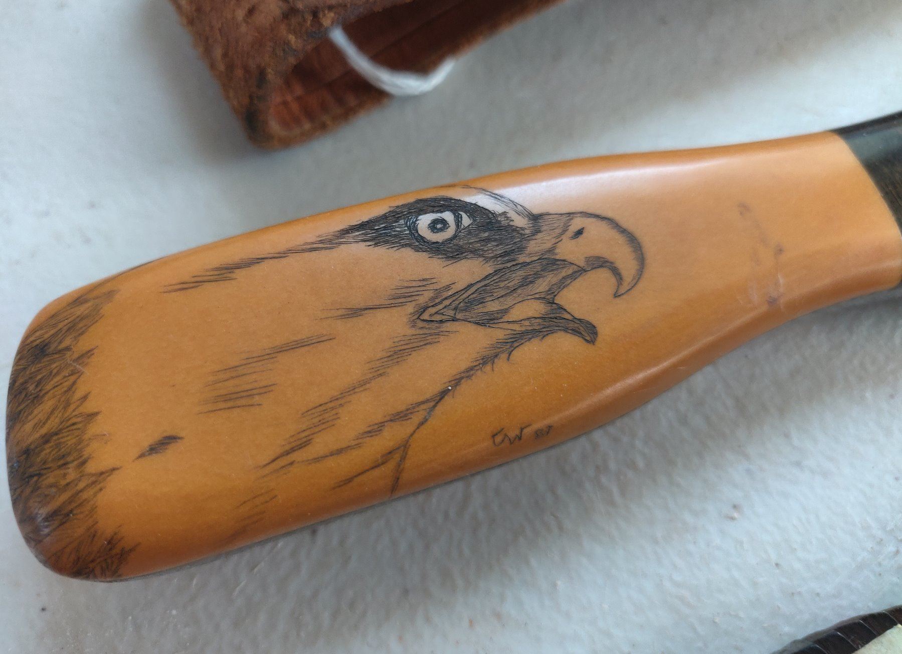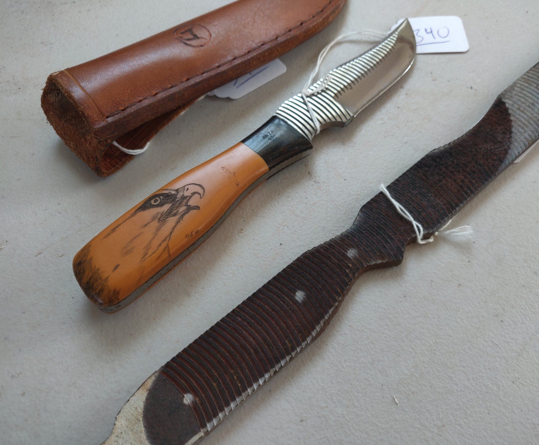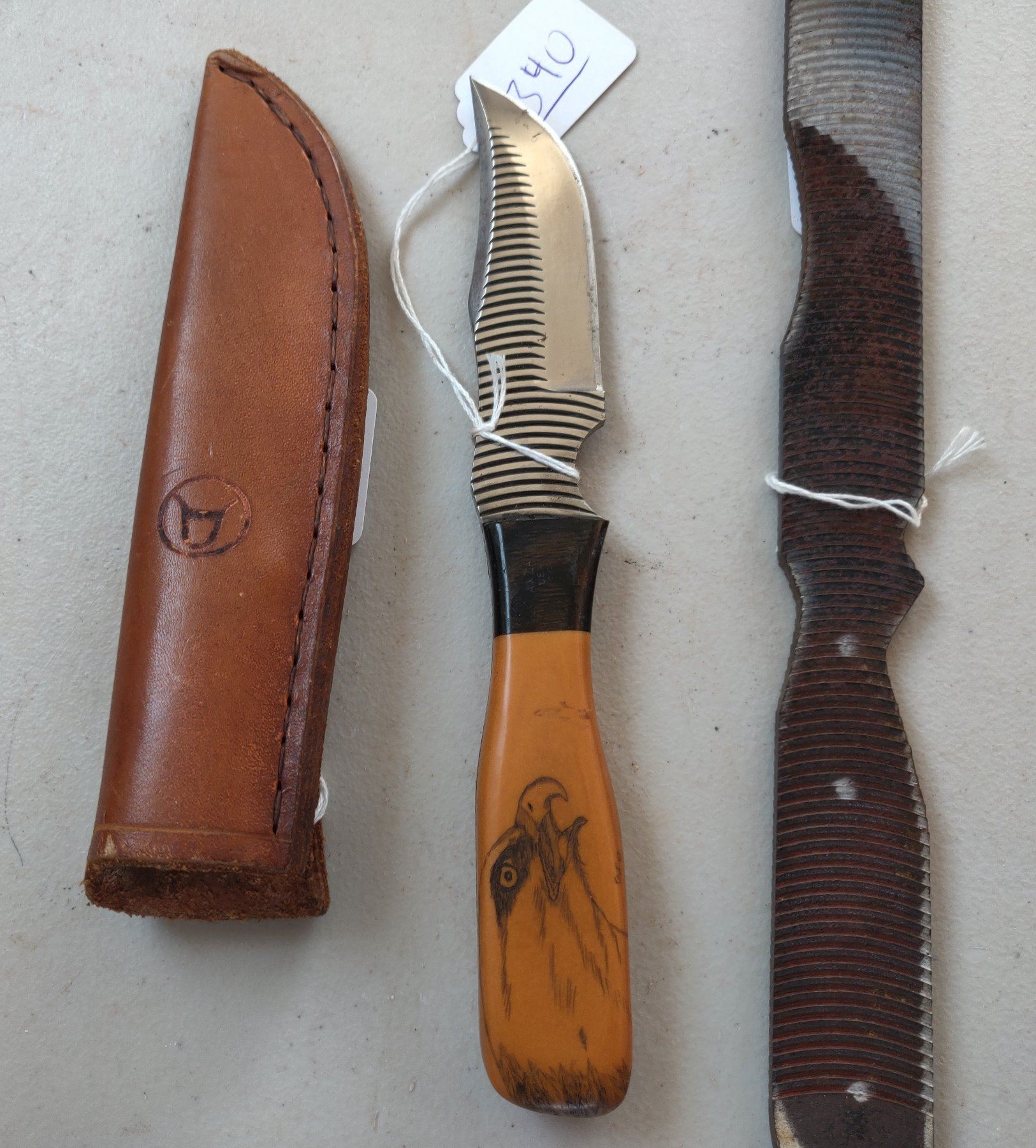 Custom Anza Bowie Knife w/Scabbard and Scrimshaw, c. 1985. Made of bakelite, steel and leather, the item measures 8 1/2" x 1" x 1", bastard file with knife pattern measures 15" long. El Cajon, California, Charlie Davis, founder of Anza Knives. One-of-a-kind knife, bastard file blank included. Condition: Good, wear from use, see images. Shipping: $22.50 w/insurance and signature, due to weight, length and value.