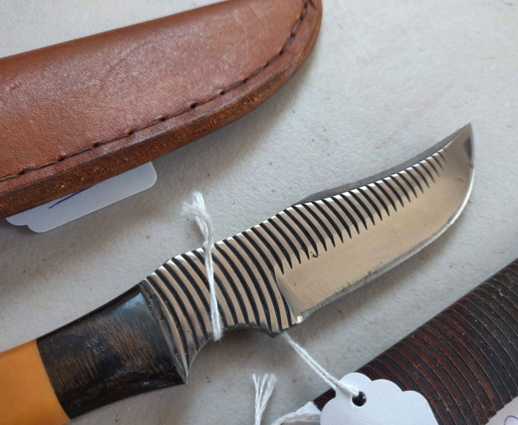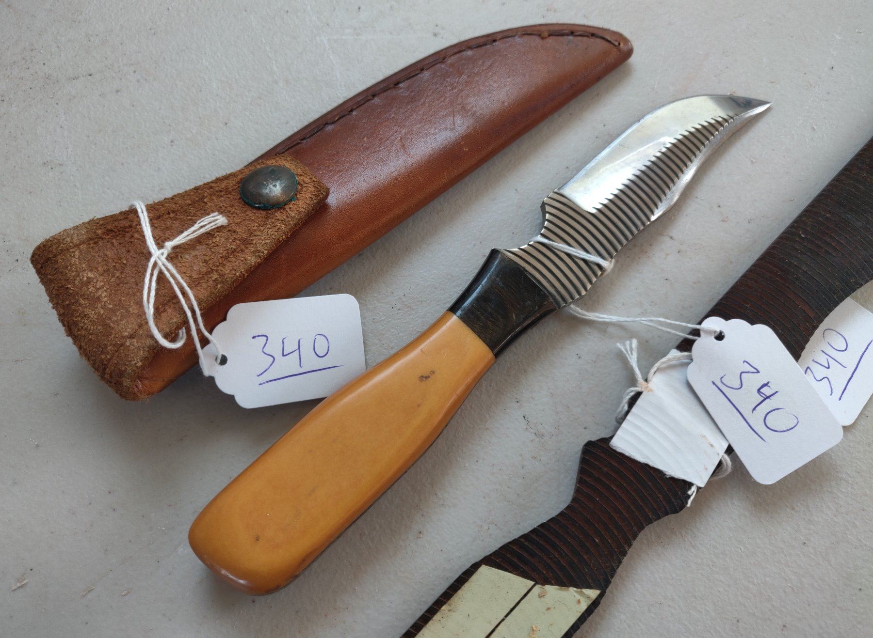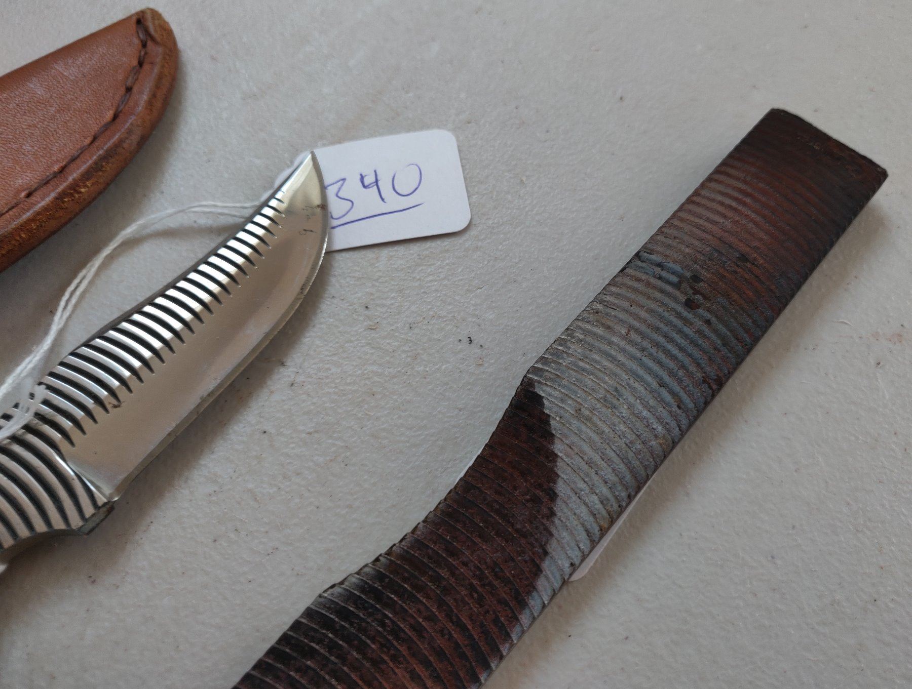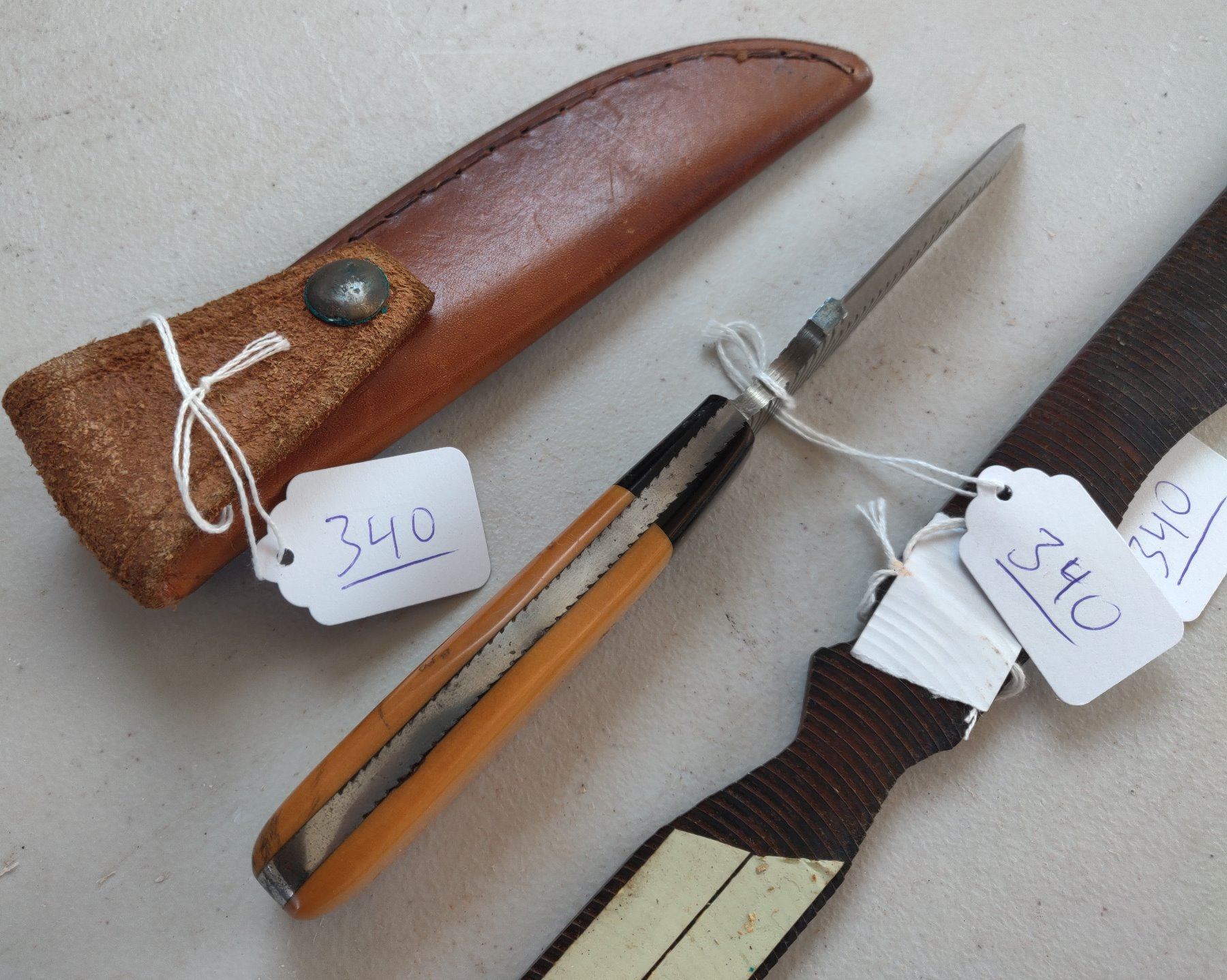 Custom Anza Bowie Knife w/Scabbard and Scrimshaw, c. 1985. Made of bakelite, steel and leather, the item measures 8 1/2" x 1" x 1", bastard file with knife pattern measures 15" long. El Cajon, California, Charlie Davis, founder of Anza Knives. One-of-a-kind knife, bastard file blank included. Condition: Good, wear from use, see images. Shipping: $22.50 w/insurance and signature, due to weight, length and value.