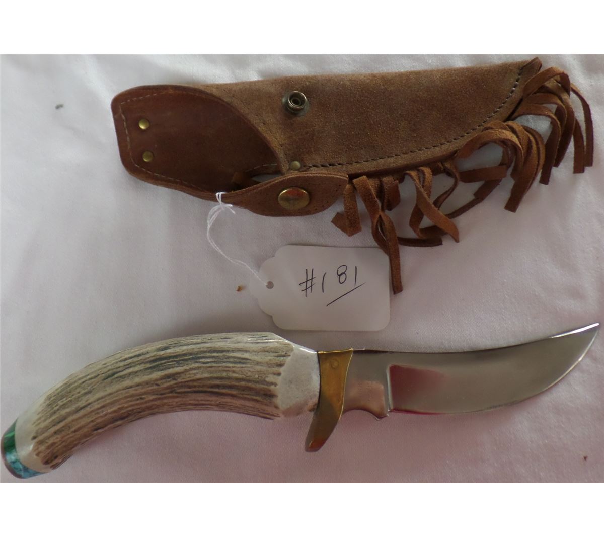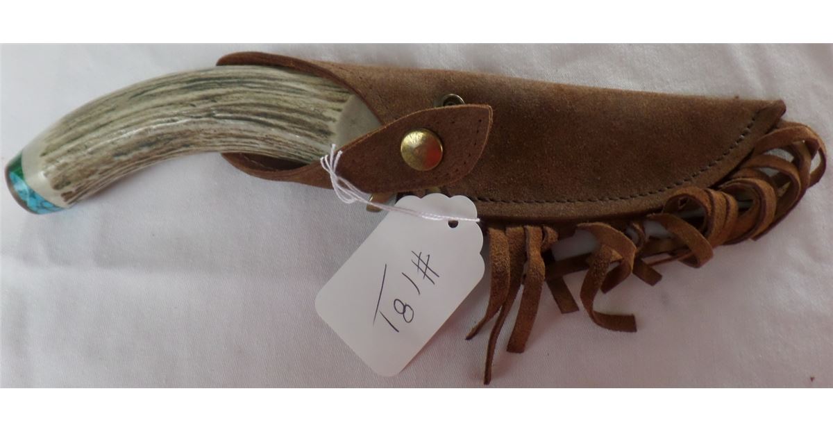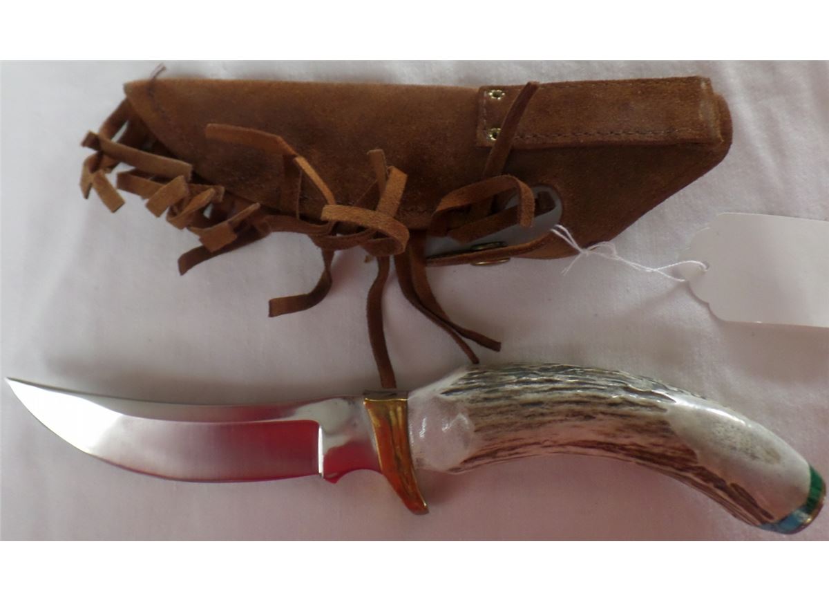 Custom Bowie Knife signed by J Jacobs. The handle is deer horn with a turquoise and malachite. This is in excellent unused condition. The Leather scabbard has fringe. Shipping $18.50