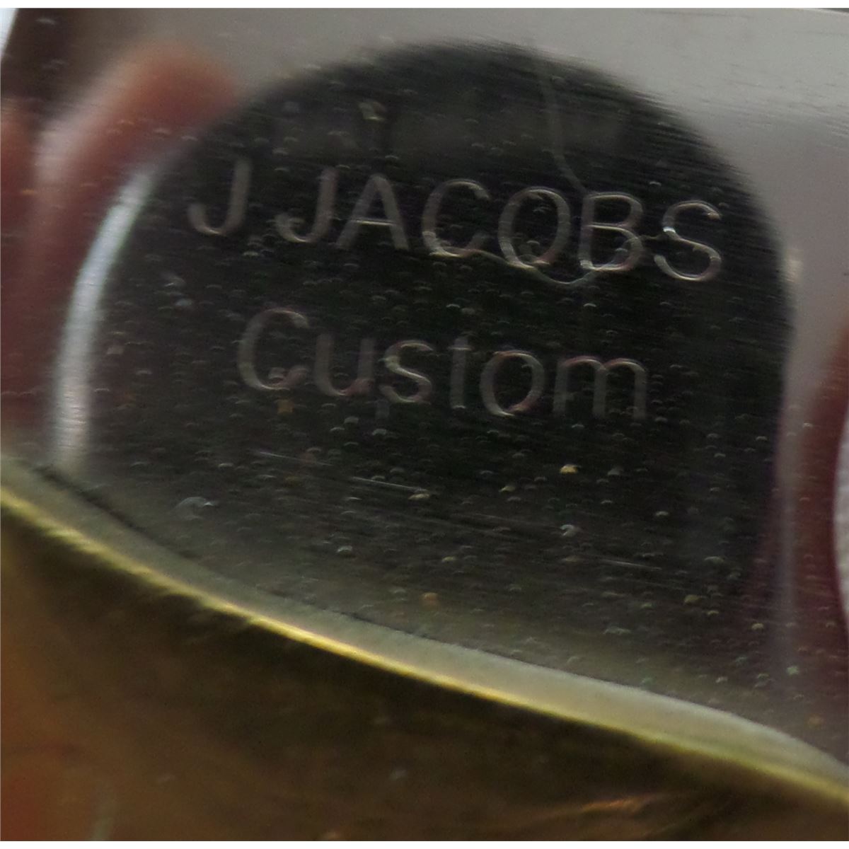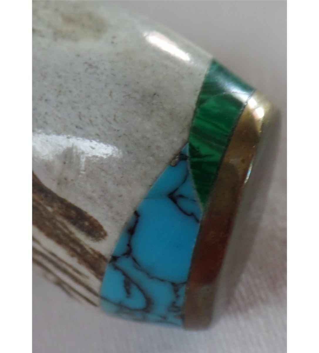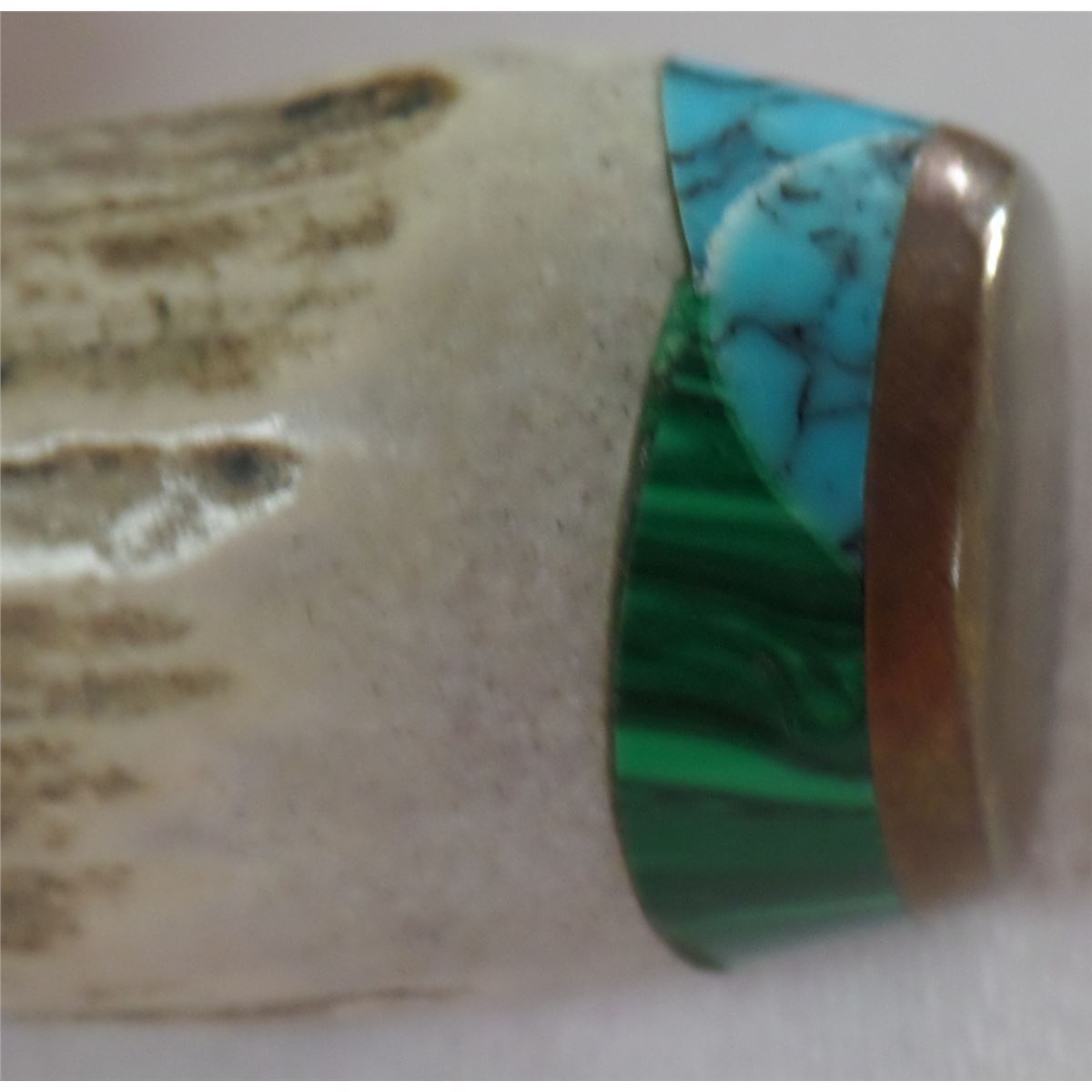 Custom Bowie Knife signed by J Jacobs. The handle is deer horn with a turquoise and malachite. This is in excellent unused condition. The Leather scabbard has fringe. Shipping $18.50
