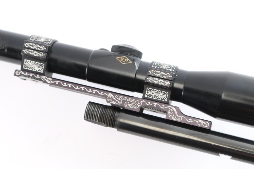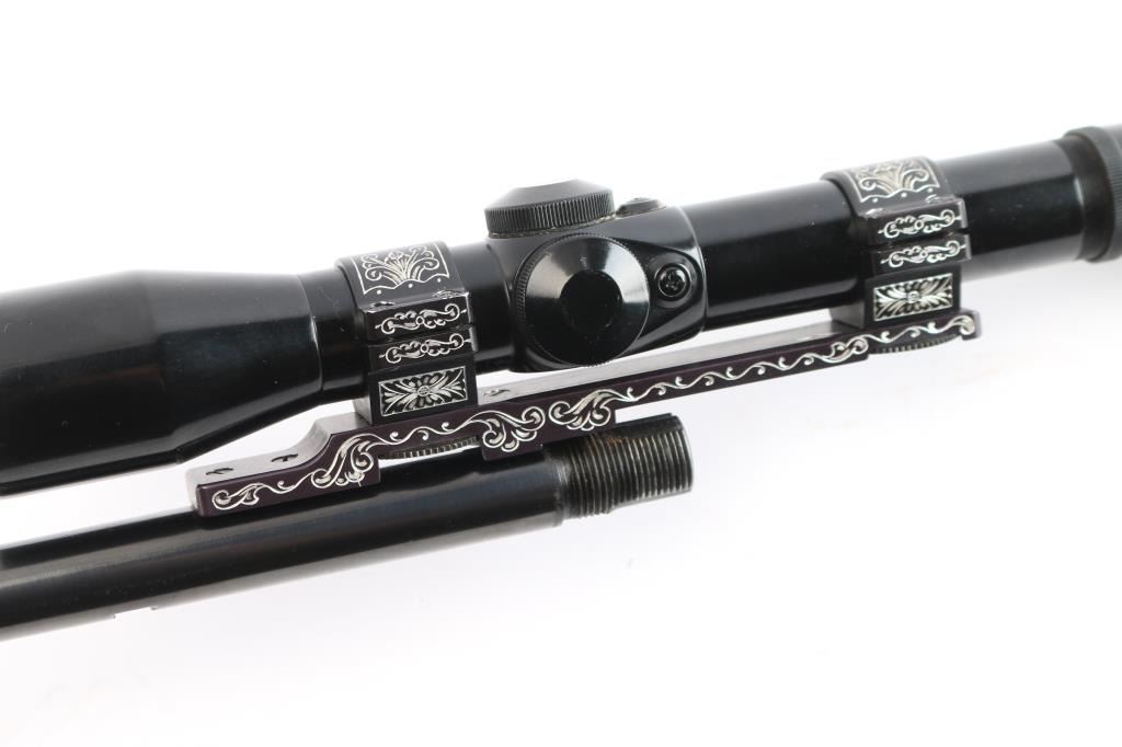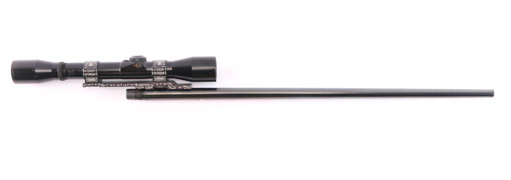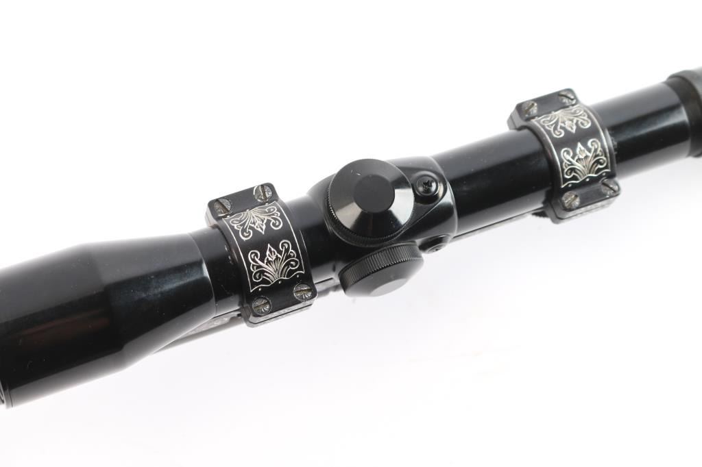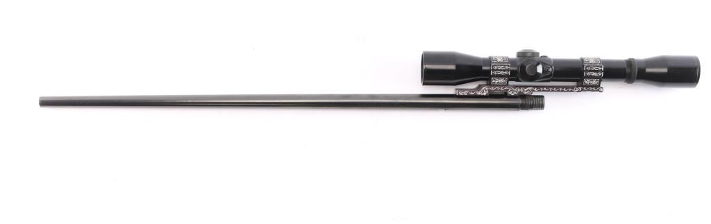 21 1/4' blued, round barrel for the Browning SA-22 semi-automatic rifle. No sights, rear sight dovetail on the underside of barrel. The bore is excellent/bright, finish has slight muzzle wear and a few minor scratches. Mounted with a Prominar 4x scope made in Kowa, Japan. Fine crosshair reticle, clear optics. Vintage Williams 'Quick Convertible' scope mount base w/1" rings. The base and rings have been engraved with very nice floral/scroll designs. excellent condition.