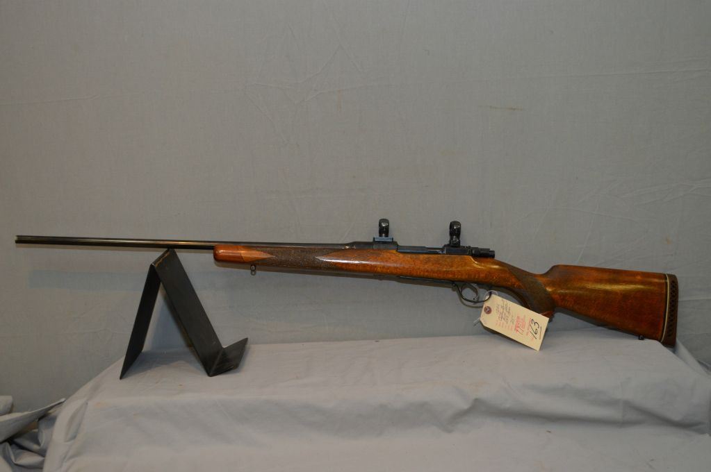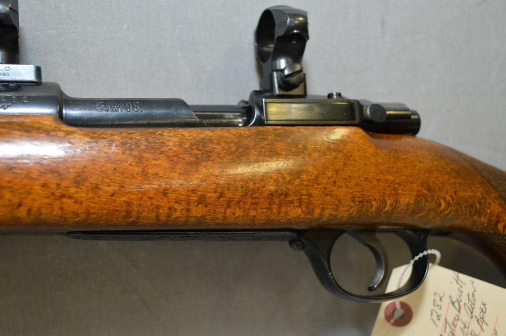Custom Built on Mauser 98 Action .248 Apex cal Wild Cat cal ( .240 H & H ) Bolt Action Rifle w/ 25" bbl [ blued finish, no sights, fitted w/ Burris front mount & Deluxe rings, exotic wood checkered stock w/ unknown reddish colored wood caps, engraved Pronghorn & oak leaf floor plate, c/w RCBS custom three die set , Owner's Notes, just a guide : .240 Apex ( H & H ) - Bullet 100 grain - Power IMR 4350 - 43 grains - Primer CCI 250 - case length 2.495" - cartridge length 3.200" ] Ser # 1282