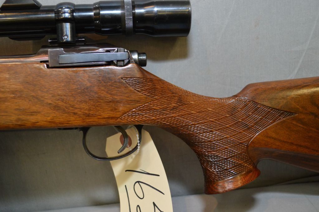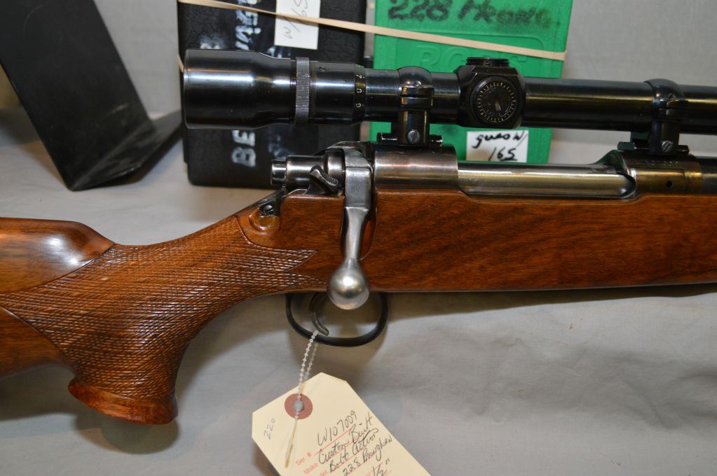 Custom Built on P14/17 style action, Mauser style bolt .228 Pronghorn Wild Cat cal Bolt Action Rifle w 25 1/2" bbl [ blued finish, no sights, fitted w/ Weaver Marksman 3 x - 9 x Variable scope missing the adjustment covers, exotic wood, swollen checkered pistol grip stock & forend w/ exotic wood caps, small chip out of grip cap, Pachmayr recoil pad, c/w RCBS Three die set plus extra die tools , Owner's notes only a guide : 228 Pronghorn - Case - 240 Wthby Primer CCI 250 - Powder A4831 - 52 grain - bullet 70 grain Hornady - case length 2.490", cartridge overall length 3.089" ] Ser # W107009