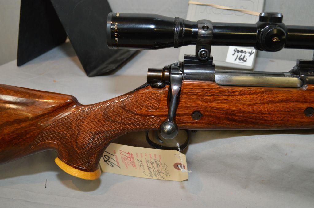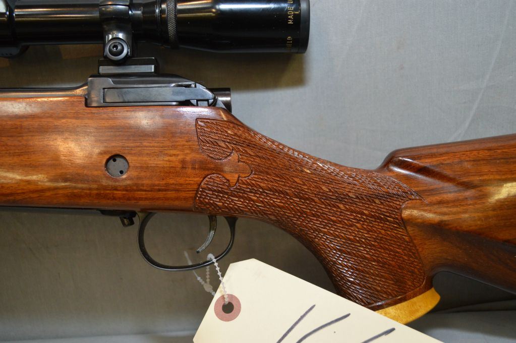 Custom Built on P14/17 style action, Mauser style bolt, .330 Boomslang Wild Cat cal Bolt Action Rifle w/ 27 1/4" bbl [ blued finish, no sights but fitted w/ Burris 6X Scope, w/rings & bases, deluxe exotic wood, swollen checkered pistol grip stock & forend, w/ exotic blonde toned caps, Kick Eez recoil pad, c/w custom 4 die set , Owner's note, guide only " .330 Boomslang - Case - .8 MM Rem Mag Primer Fed 215 - powder IMR 7828 - 82 Grain bullet - 225 grain - case length 2.824" - cartridge length 3.594" ] Ser # 564102