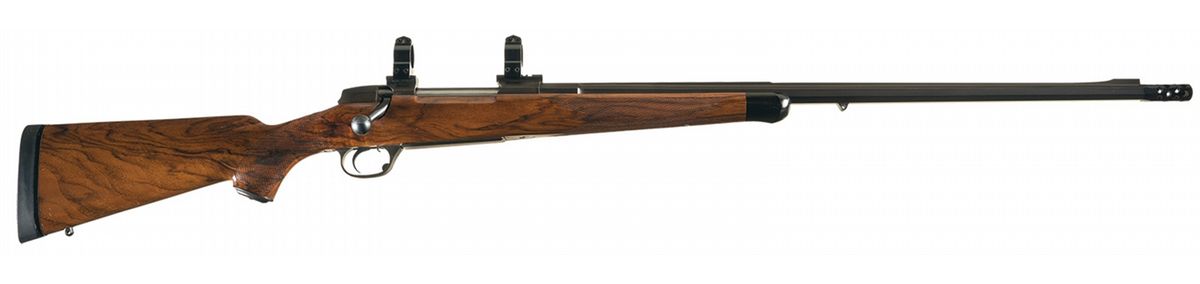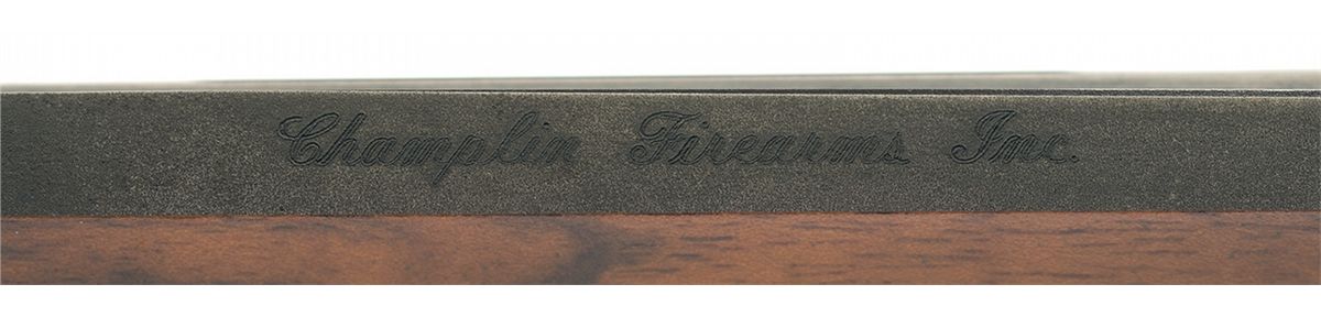 Custom manufactured with a Champlin Firearms action with a tang safety. This rifle has an octagon barrel with muzzle break chambered in .338-378 KT caliber. Mounted to the top of the action are two scope mounts with scope rings. Mounted to a finely checkered fancy English walnut pistol grip stock with raised cheekpiece, contrasting Schnabel forend, steel grip cap, Pachmayr Decelerator solid recoil pad and sling swivel studs.