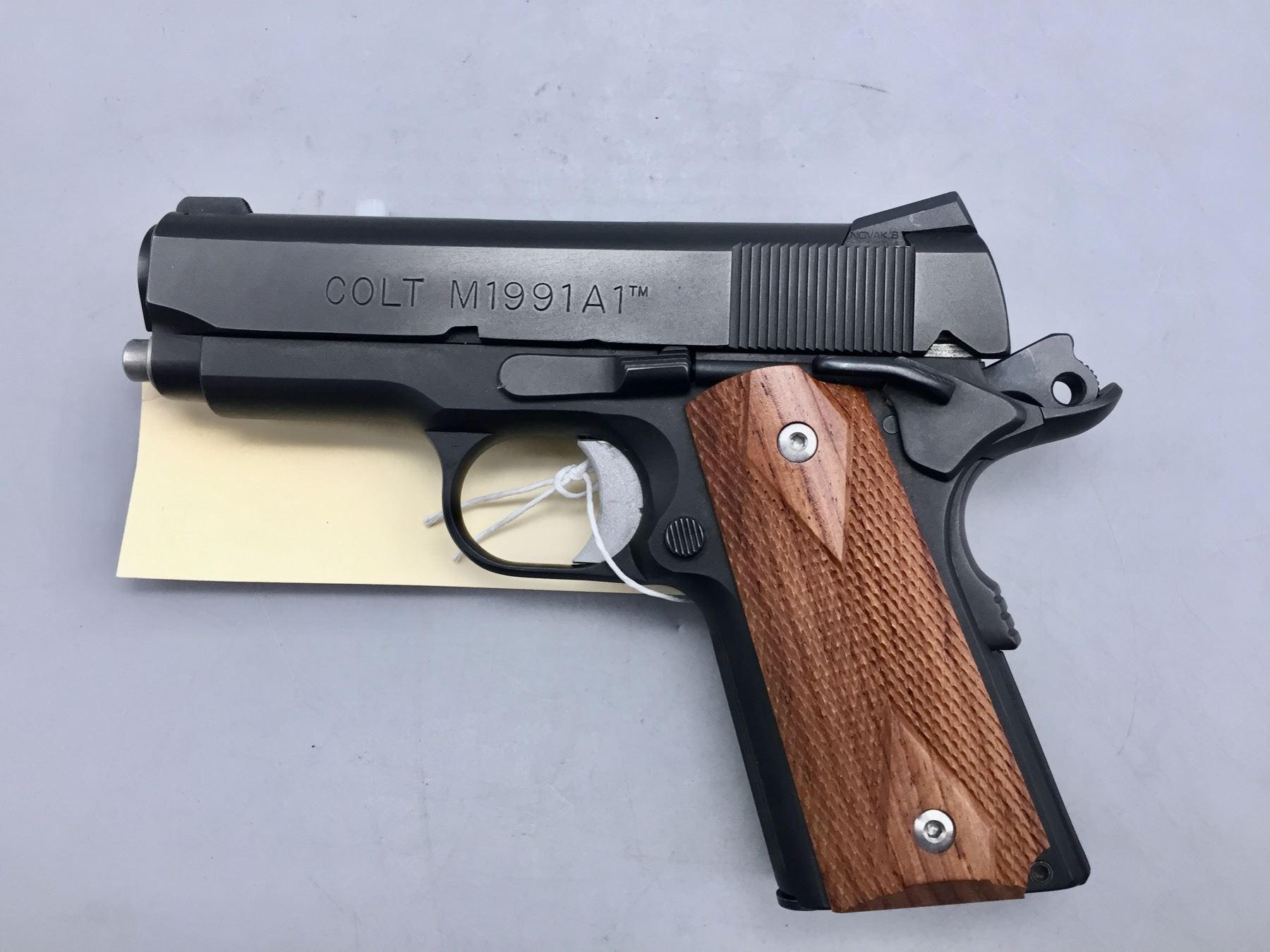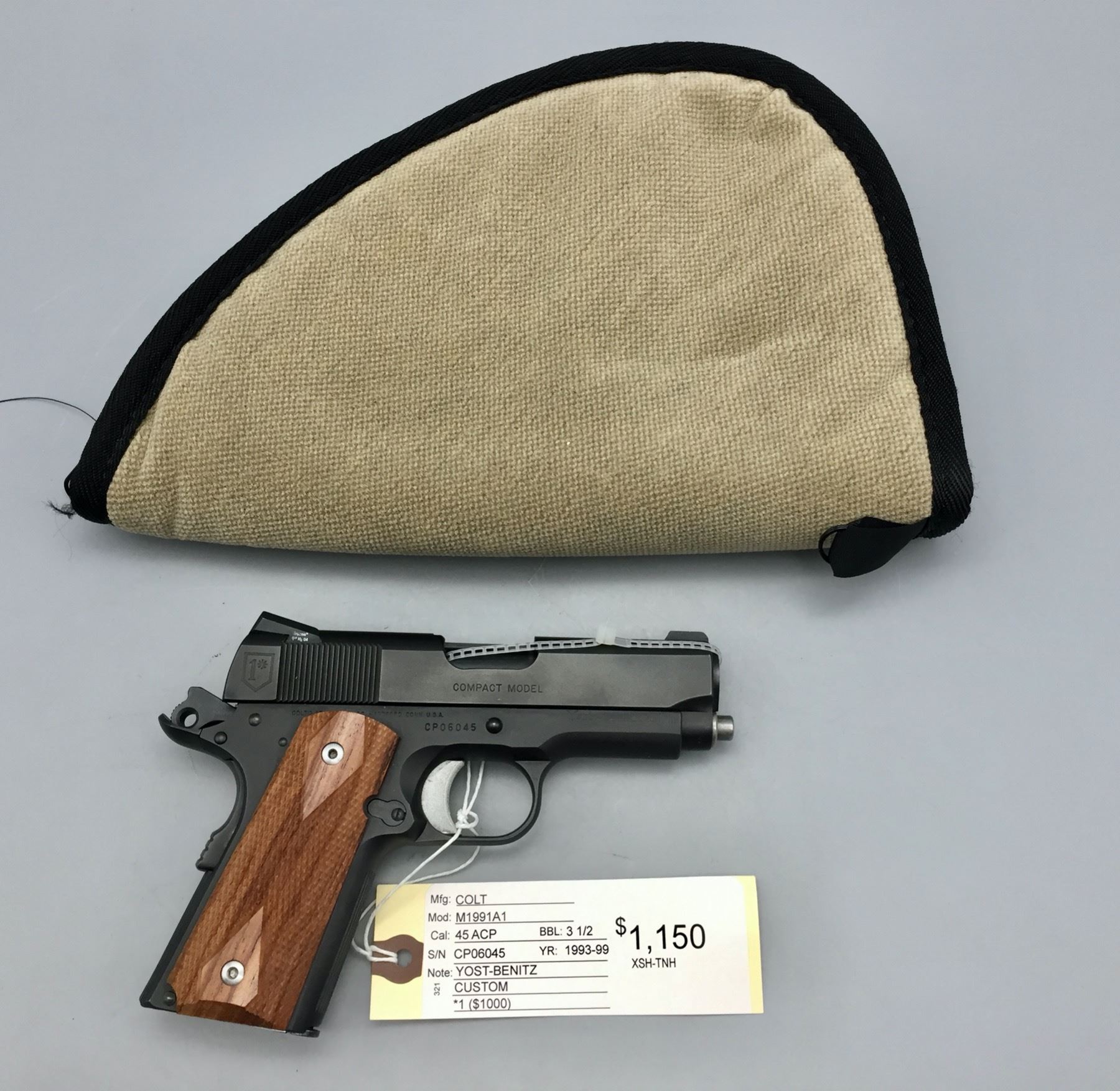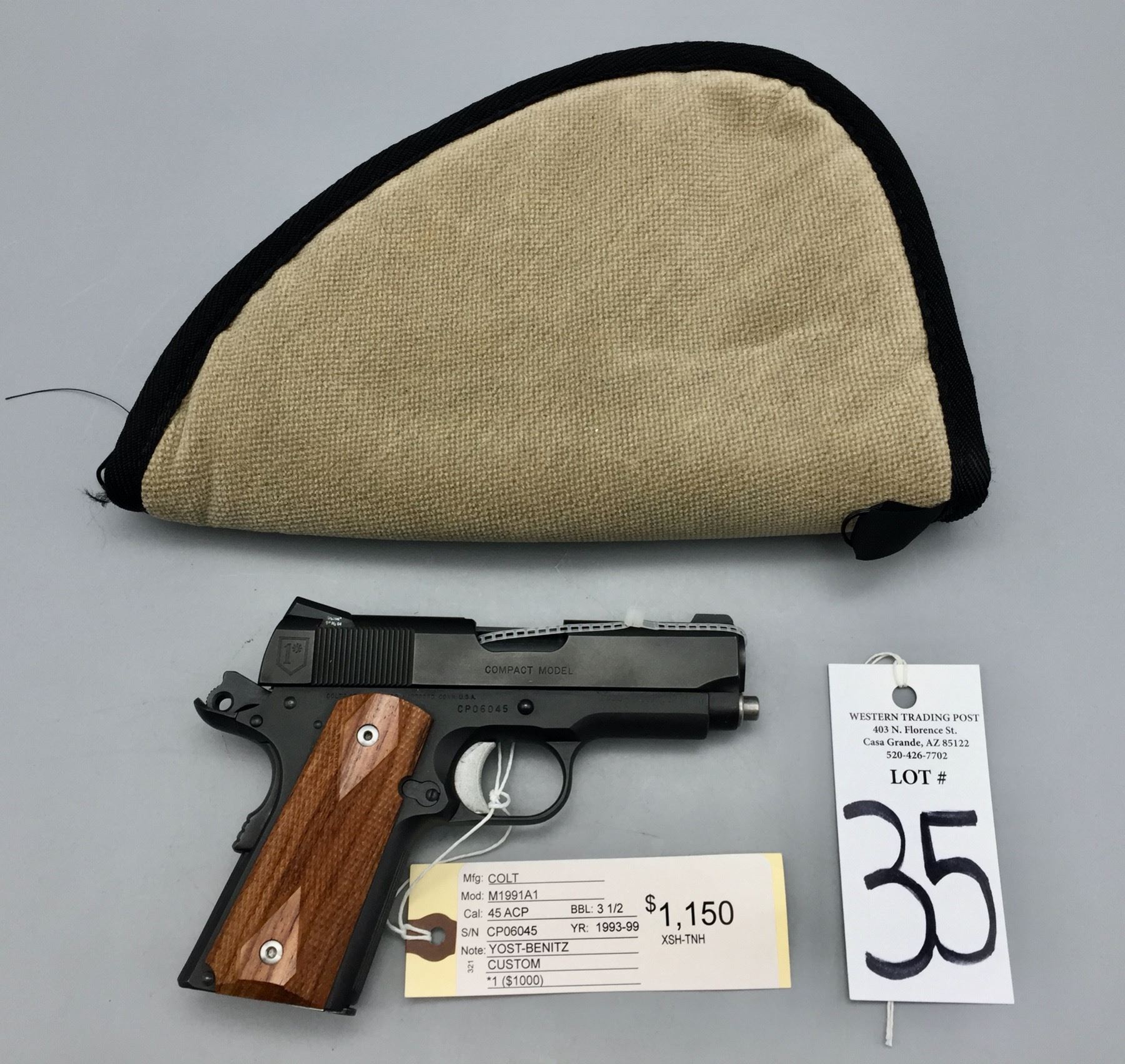 Description: Presented for sale in this lot is a Yost-Bonitz custom Colt Model 1991A1 in a .45 caliber with wood grips. Pistol comes with a padded case and is in like new condition. Maker: Colt. Approx. Age: 1993 - 1999. Serial No. CP06045. Size: Barrel measures 3-1/2 inches long. Condition: Good to excellent. Please look closely at the pictures - they are an important part of our description. Shipping: There will be a $15 handling, packaging fee for shipping this lot. The actual cost of postage will be added on top of that. *****This firearm requires an FFL Transfer*****