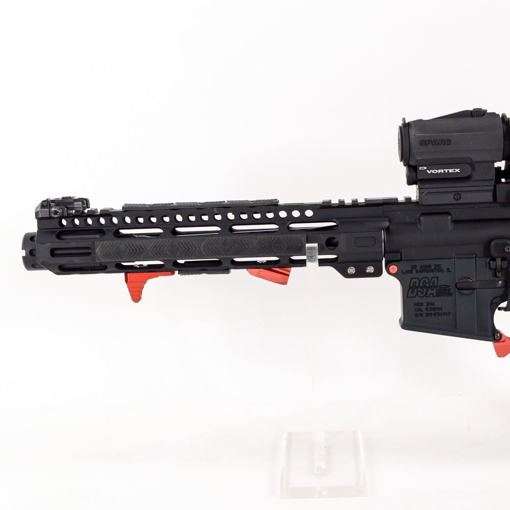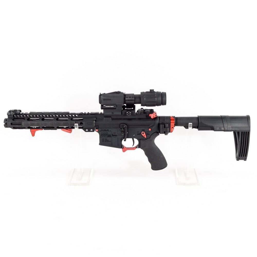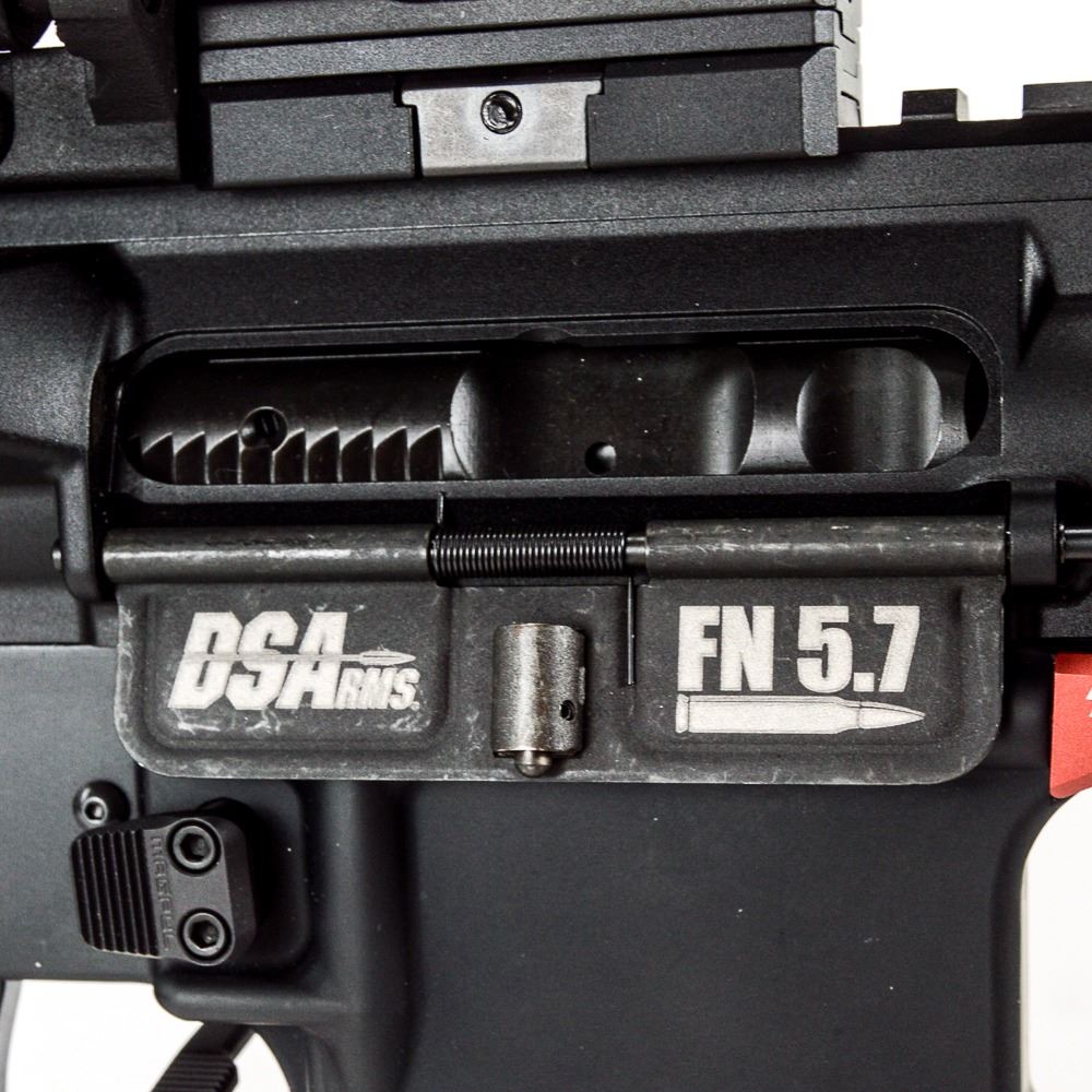 Custom DS Arms ZM4 5.7x28 Pistol with Vortex Sparc red dot and Bushnell 3x magnifier, LAW Tactical folder, Tailhook brace, Strike hand stop, sling mount, TD pins, trigger guard, ambi-safety, forward assist, latchless charging handle and rear sling mount, Magpul MBUS Pro sights and BAD. The firearm is in excellent condition 2x empty magazines, plus 8x loaded magazines in ammo can. S/N: ZM-034947