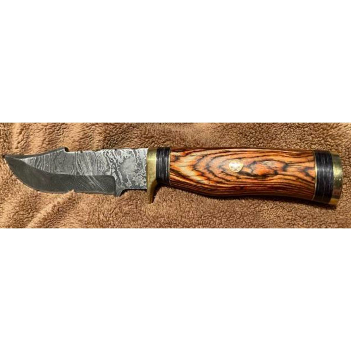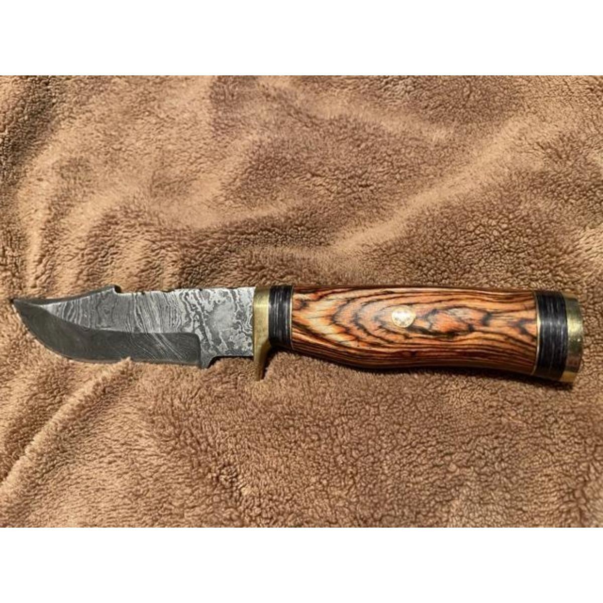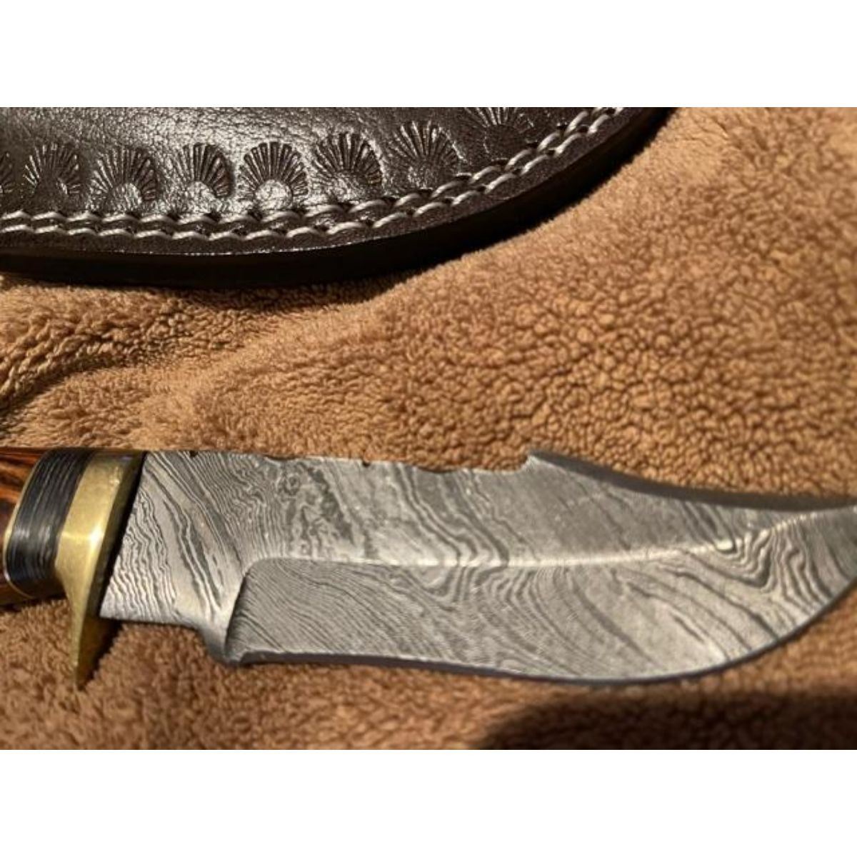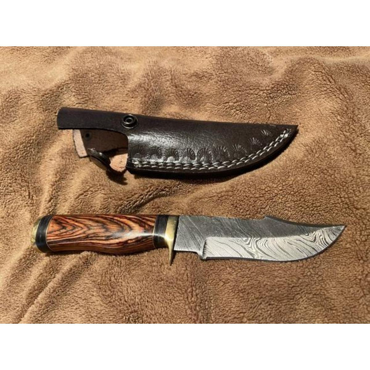 Custom Damascus steel hunting knife. High carbon steel ( hardness 55-58HRC ). 8 inch length ( 4 inch blade ) with brass and wood handle. 512 layers of stainless and high carbon steel in the blade. Comes with leather sheath. Â