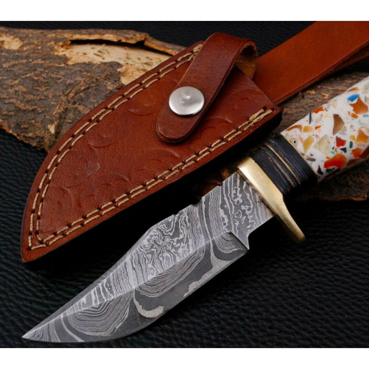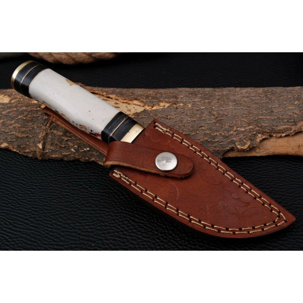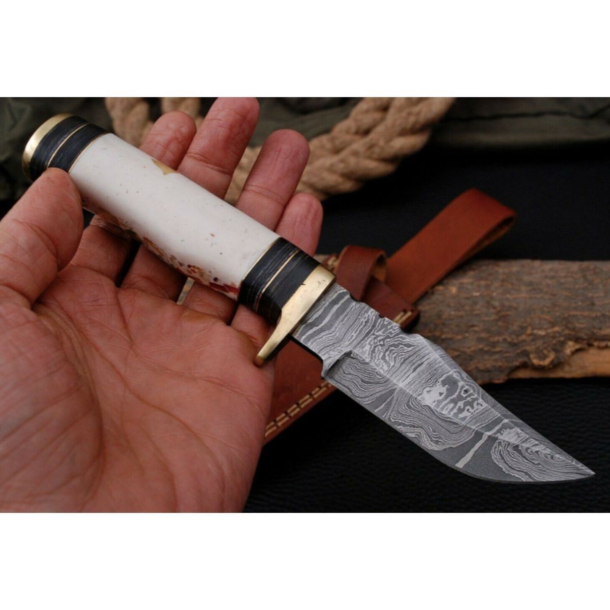 Custom, hand-forged Damascus steel blade, made of 512 layers of stainless steel and high carbon steel with hardness 55-60 HRC. 8" overall length, 4" blade, 4" composite handle. Comes with leather sheath. Â