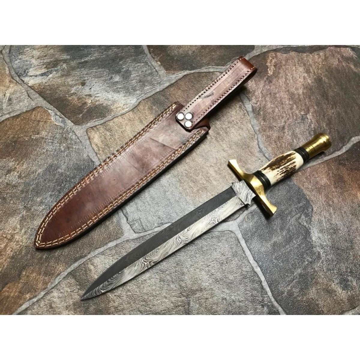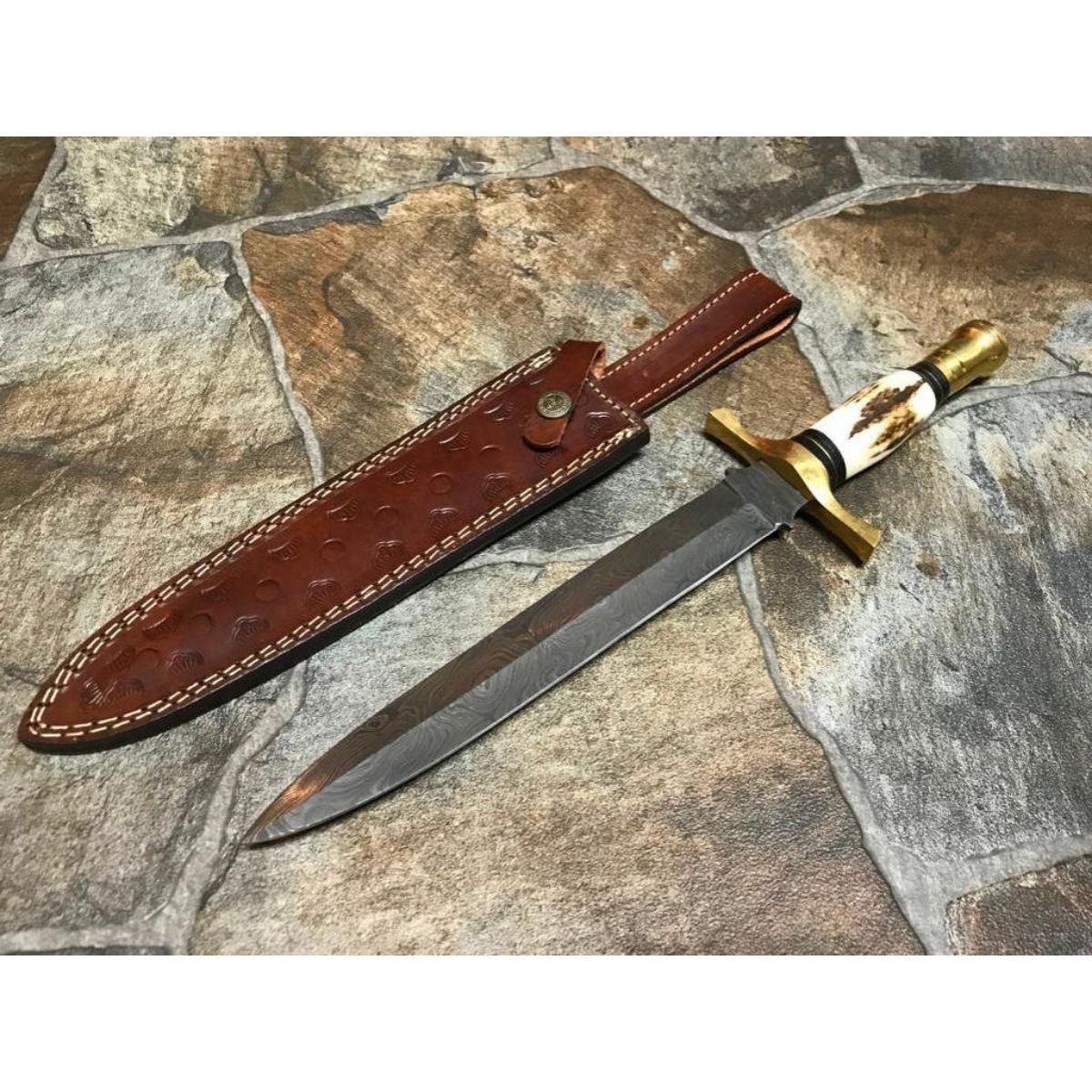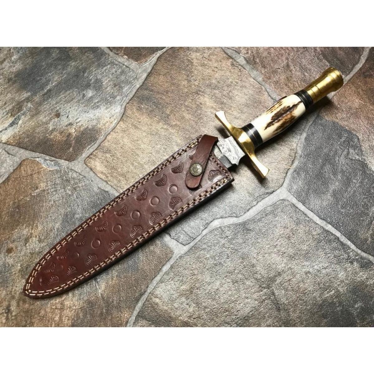 Hand-made custom Damascus steel hunting dagger / knife with stag horn handle.Hand forged blade with above 216 layers of 1095 & 15n20 high carbon tool steels, with nickle layer & excellent heat treatment to get to 56 To 57 Hrc. Leather sheath. Overall length 14.5†Blade Length 9.5’’ Handle length 5.0’’ . 10479-051418-EB-12062
