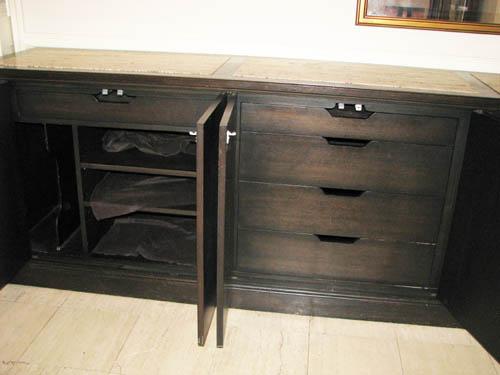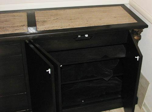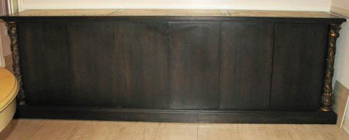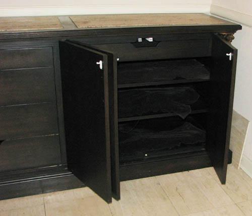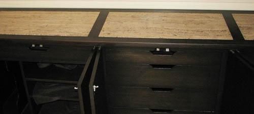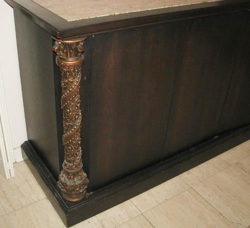 Title: Custom Designed Travertine Top Credenza with carved column decoration, 3 compartments, center with four drawers including pull out silverware drawer, 2 sides with silver drawer over shelves
