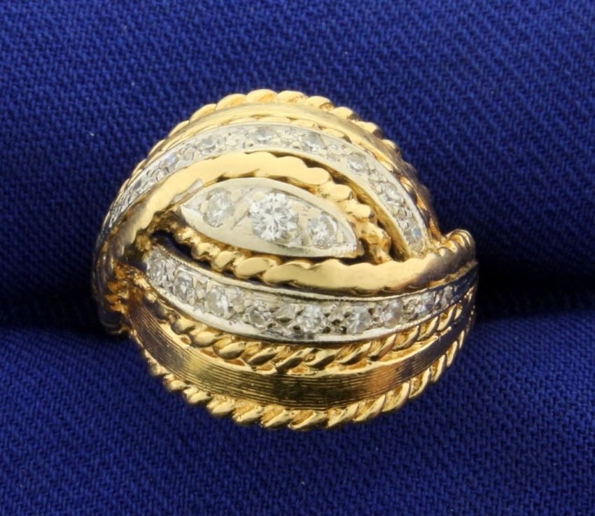 In 14k white and yellow gold. Contains 1/4 ct TW of high quality diamonds, VS clarity/G color. Size 8 1/4. 8.1g.