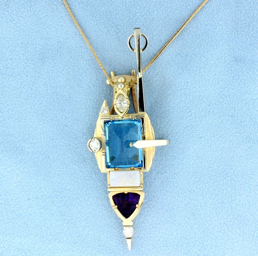 There is a Swiss Blue emerald cut Topaz 16mmx12mm approx. 10 carats. The opal is rectangular 10mmx6mm and a trillion cut Amethyst 10mmx10mm. There are 3/4 carat of brilliant cut diamonds and a marquise cut diamond. Clarity is VS-SI2, color G-I. Chain is 22" long and snake design. Piece is expertly crafted and truly unique. 26.8