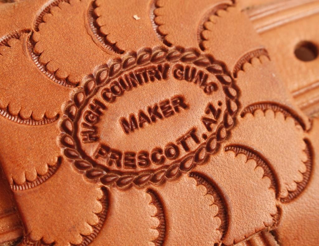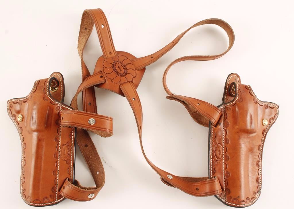 Well crafted tooled brown leather double shoulder holster rig by High Country Guns of Prescott, AZ. Fits single action revolvers. *Note - The last counterpart of a set of two Ruger Vaqueros with 3.75" barrels and birds head grips.