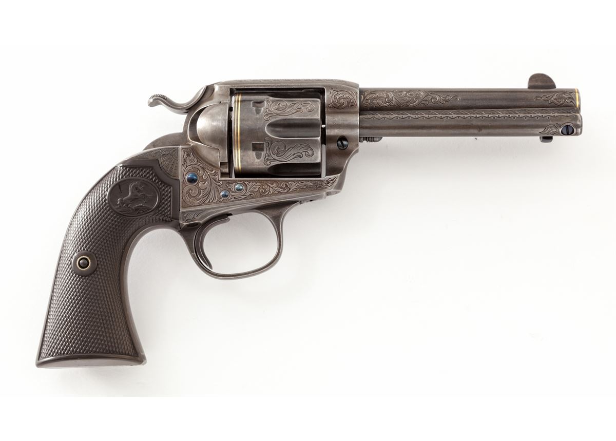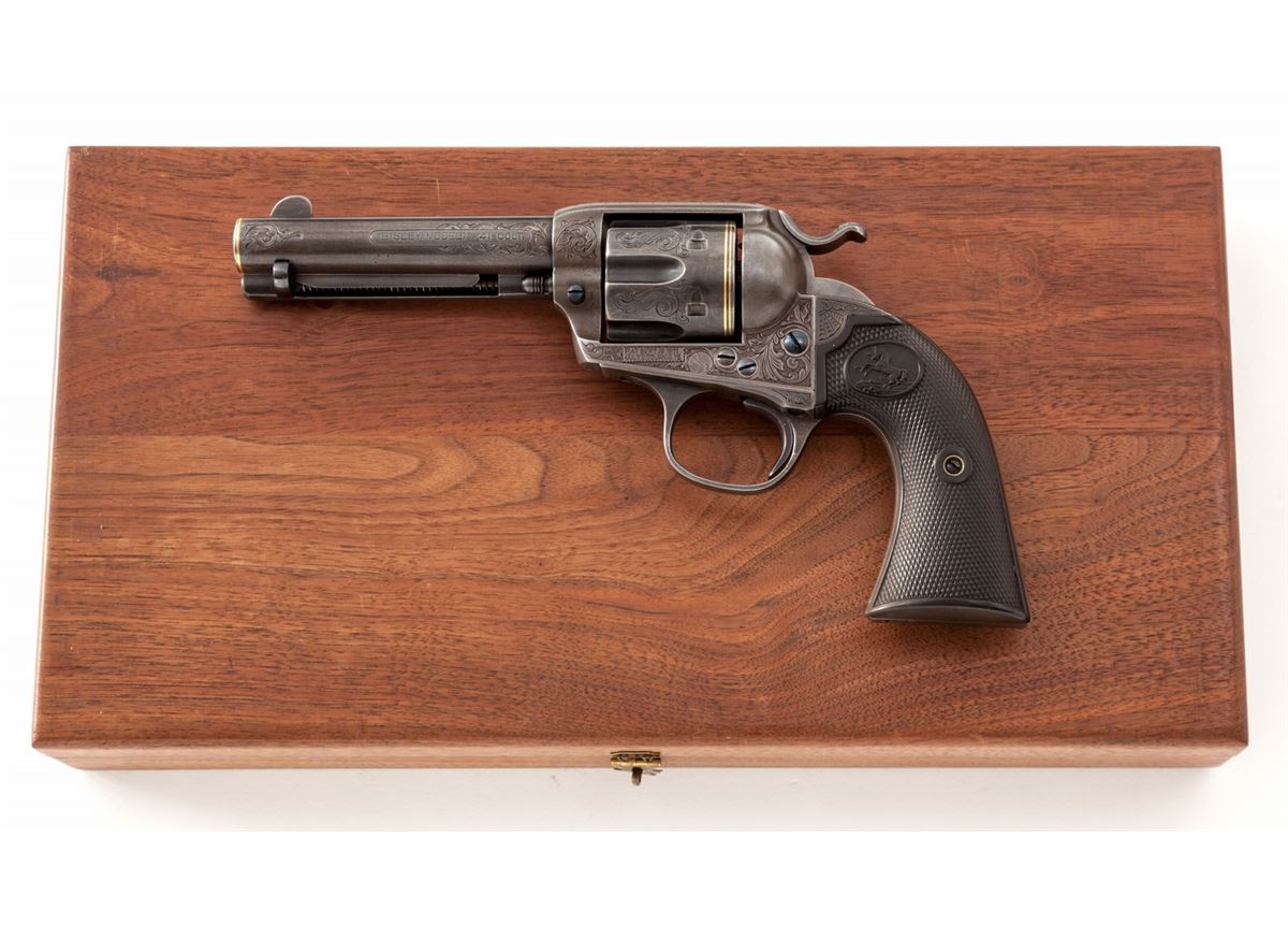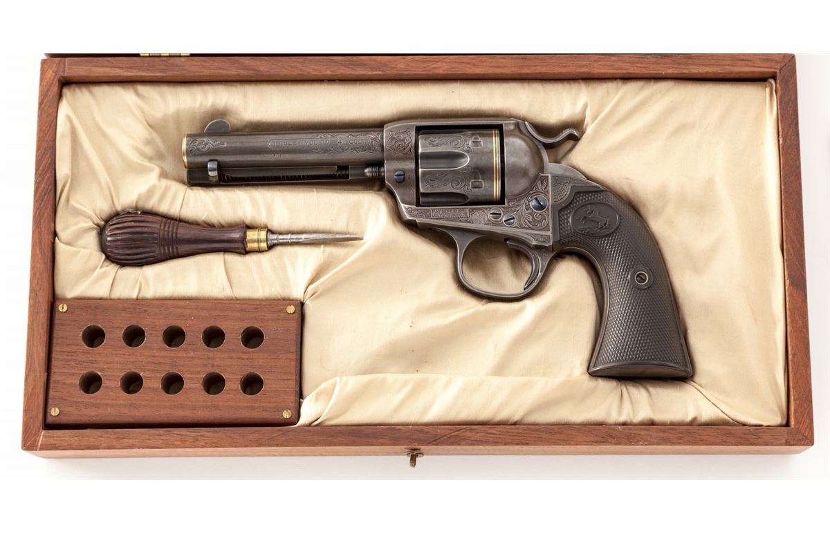 Custom Embellished Colt Bisley Single Action Revolver, #284814, .41 Colt cal., 4-3/4'' barrel, engraved in the 19th Century style, finished in French grey, with one gold band at muzzle and two gold bands at rear portion of cylinder; factory checkered hard rubber grips, with customization work done by W.B. Ellis, and so signed just above serial number on frame. Mfg'd 1906. Condition is excellent as modified with metal surfaces being an even medium gray. Grips with just slight flattening. Action and bore are good. Included is a hobbyist crafted walnut box with rosewood handled screwdriver and block for cartridges. Est.: $2,500-$4,000. (C&R/PPT)