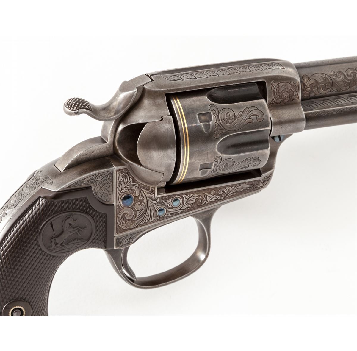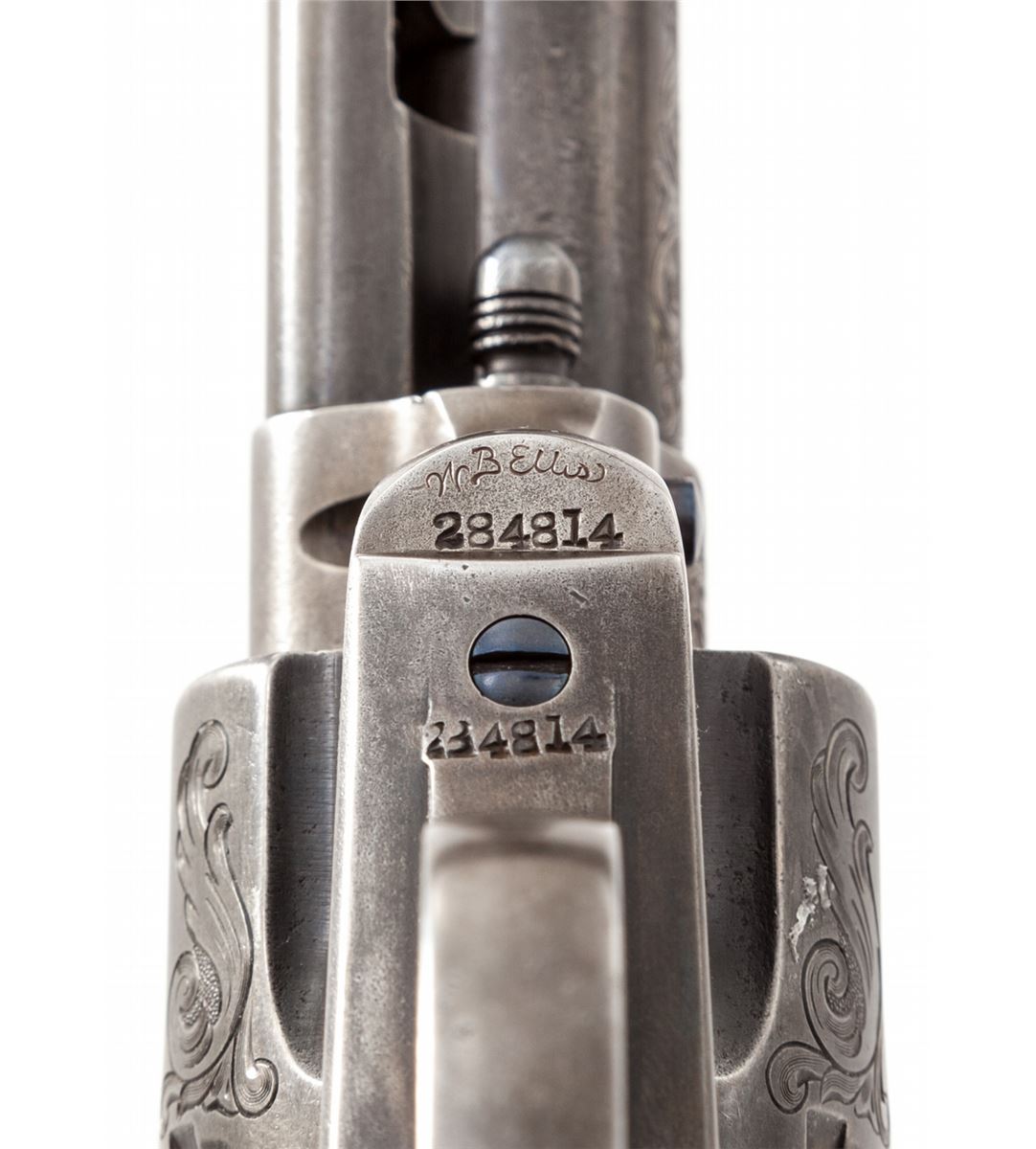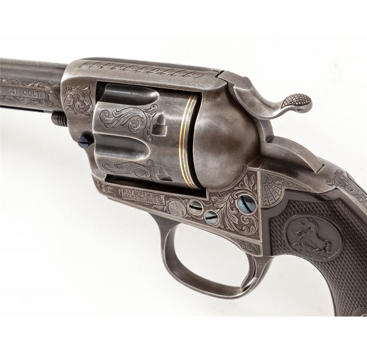 Custom Embellished Colt Bisley Single Action Revolver, #284814, .41 Colt cal., 4-3/4'' barrel, engraved in the 19th Century style, finished in French grey, with one gold band at muzzle and two gold bands at rear portion of cylinder; factory checkered hard rubber grips, with customization work done by W.B. Ellis, and so signed just above serial number on frame. Mfg'd 1906. Condition is excellent as modified with metal surfaces being an even medium gray. Grips with just slight flattening. Action and bore are good. Included is a hobbyist crafted walnut box with rosewood handled screwdriver and block for cartridges. Est.: $2,500-$4,000. (C&R/PPT)