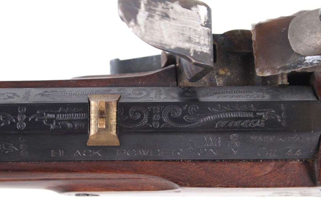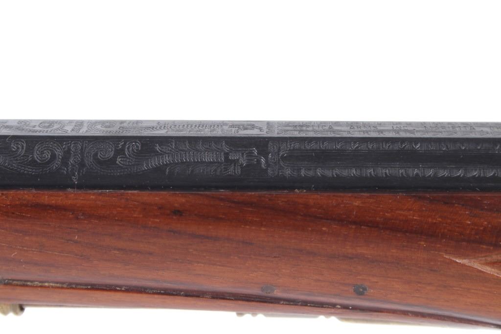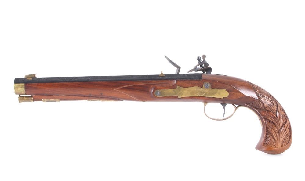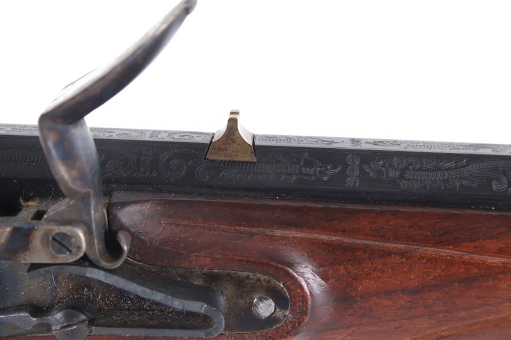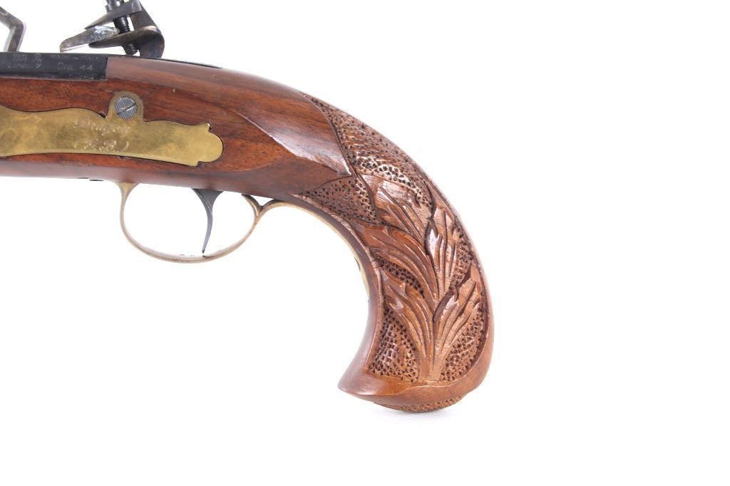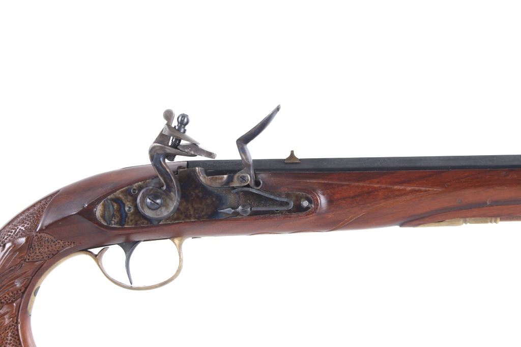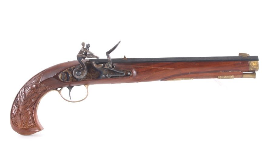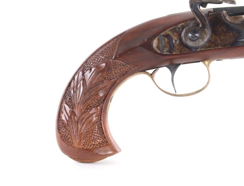 Fancy, custom engraved/carved presentation .44 caliber flintlock Kentucky Pistol. This pistol was made by famed maker of extremely high quality modern and replica arms Pedersoli of Italy and was imported by Replica Arms of Marietta, Ohio. This outstanding 1780s style pistol features a 10 ½” profusely, professionally engraved rifled barrel. The exposed top three flats of the barrel display this fine engraving along with the above mentioned markings. It is fitted with a brass front sight with corresponding notched brass rear sight, of which both are set in dovetails for windage adjustments. The