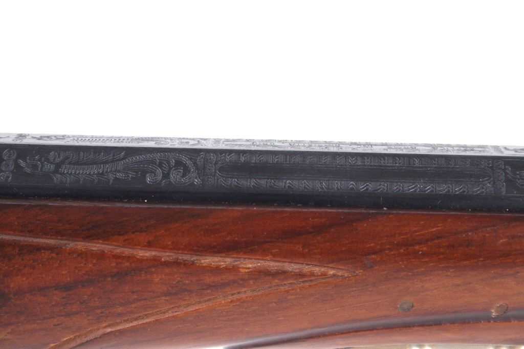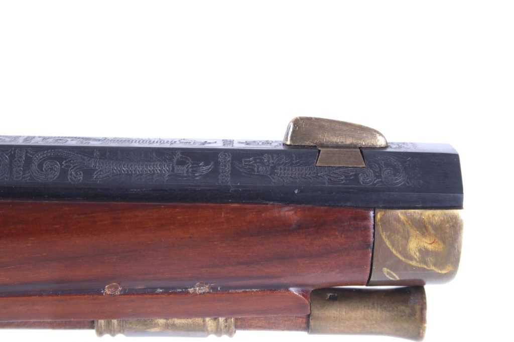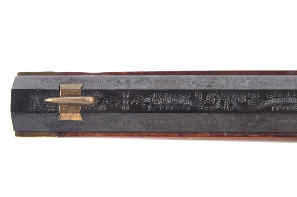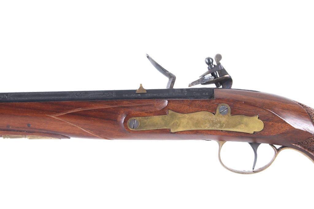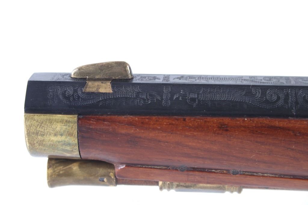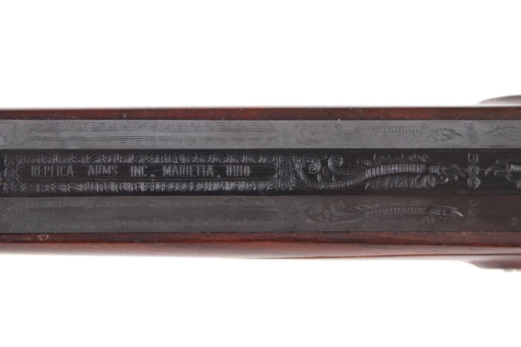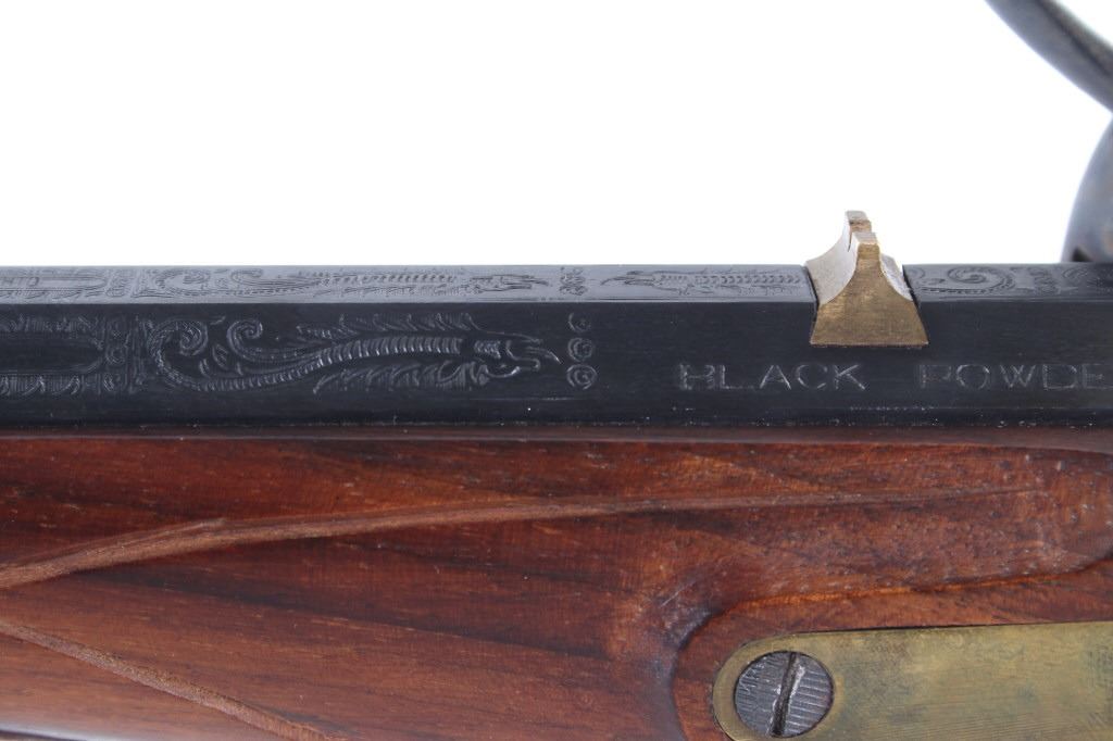 Fancy, custom engraved/carved presentation .44 caliber flintlock Kentucky Pistol. This pistol was made by famed maker of extremely high quality modern and replica arms Pedersoli of Italy and was imported by Replica Arms of Marietta, Ohio. This outstanding 1780s style pistol features a 10 ½” profusely, professionally engraved rifled barrel. The exposed top three flats of the barrel display this fine engraving along with the above mentioned markings. It is fitted with a brass front sight with corresponding notched brass rear sight, of which both are set in dovetails for windage adjustments. The