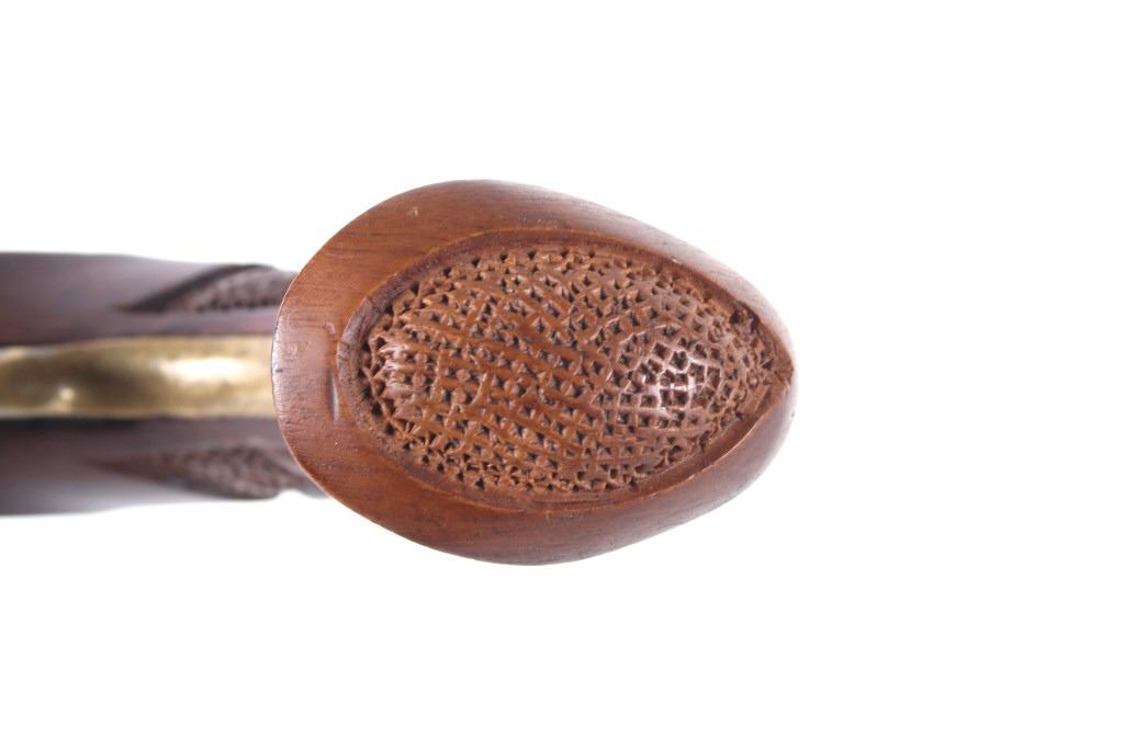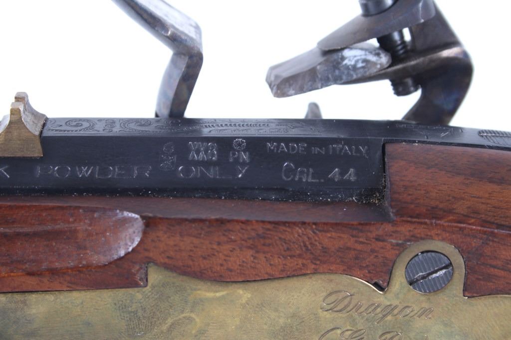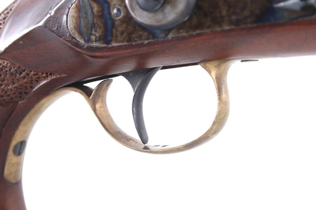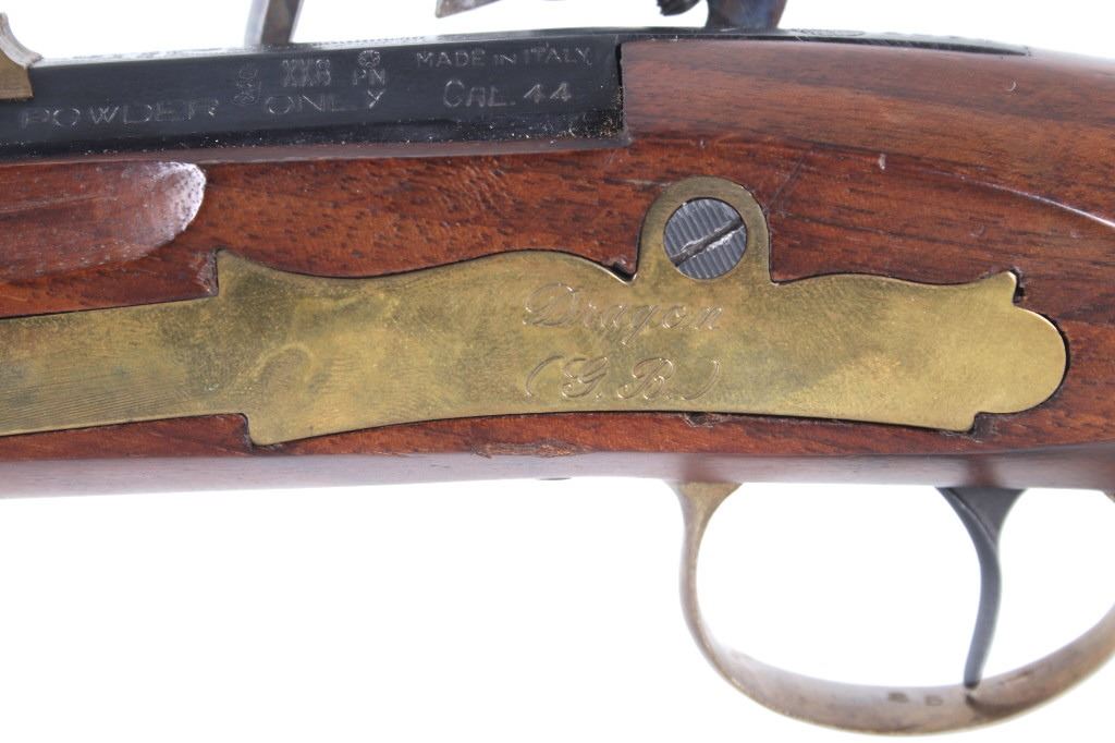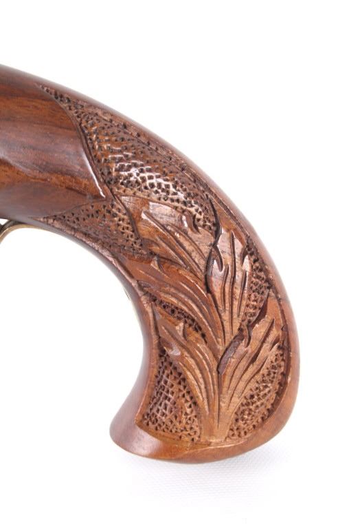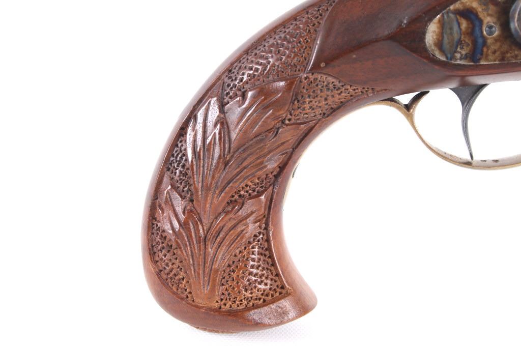 are all of mellow brass. The side plate on the left side is engraved in script lettering “Dragon” over “(G.B.).” The entire walnut grip is superbly relief carved with a vine motif on each side set off by a punch-dot background. The butt also has this punch-dot carving. There is also some light carving to the front of the wood ahead of the trigger guard. Interestingly, the ramrod thinbles are set into a wood underib which on standard firearms is almost always metal. Overall, a very special fancy engraved and carved Kentucky flintlock pistol at home in the finest of early frontier displays or on the black powder firing range! Superb Pedersoli quality inside and out. Serial Number: 8097. This firearm qualifies as an Antique, and does not require FFL Transfer or NICS Background Check.