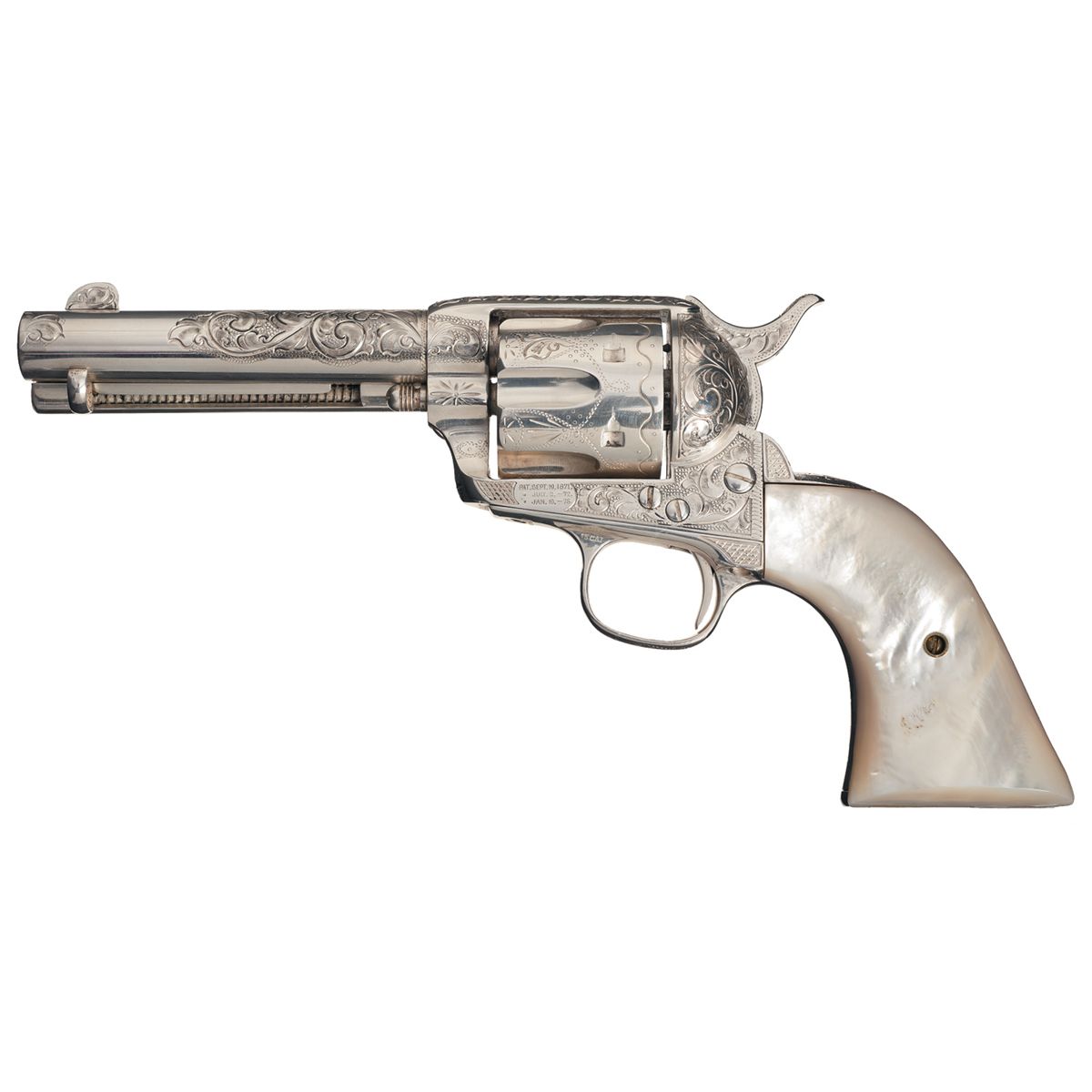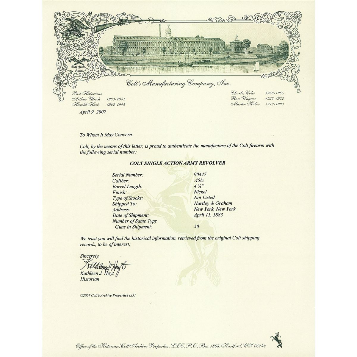 Manufactured in 1883 and subsequently custom embellished in the 20th century with the New York/Hartley style of engraving. The barrel, frame and top of the back strap are decorated with floral scroll and punch dot engraving. The sides of the front sight have the same design. The sides of the hammer and top strap have a feather design, with a zig-zag border on the hammer. The cylinder flats are decorated with alternating floral scroll and simple line designs over each chamber, as well as wavy line, dot and zig-zag patterns. The butt and trigger guard have a star burst and zig-zag design. The top of the barrel is marked with the short two line address with zig-zag border, the left side of the frame is marked with the three-line , three patent dates, the upper left front of the trigger guard is marked "45 CAL" and the matching serial number is marked on the bottom of the barrel, trigger guard and back strap. All nickel finish and fitted with smooth pearl grips. The accompanying factory letter, the caliber, barrel length, nickel finish, with grips as "Not Listed" and that it was shipped as I of 50 guns to Hartley & Graham, New York, New York on April 11, 1883.