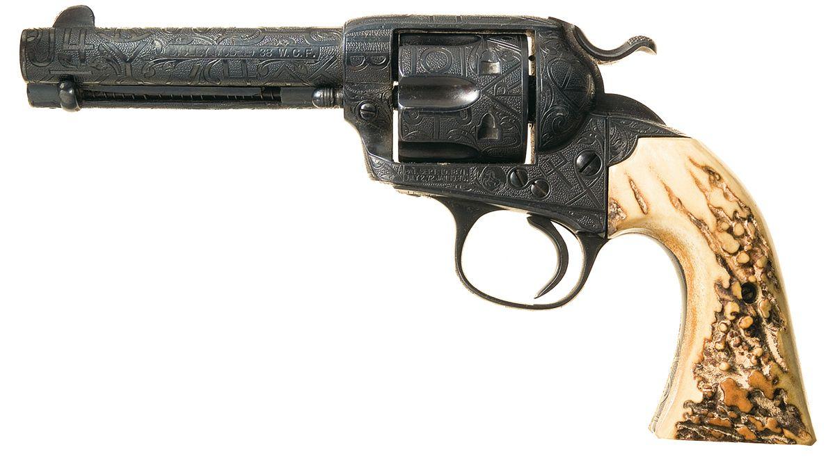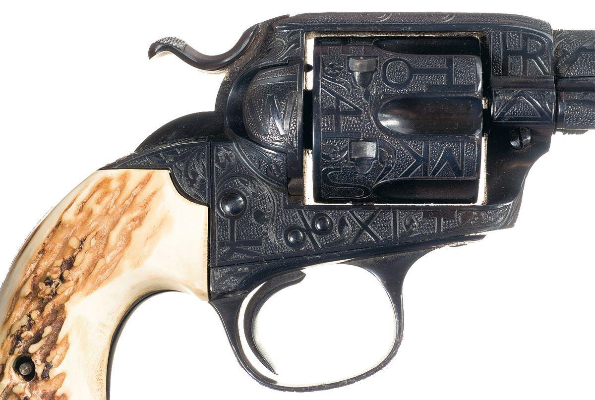 Standard markings and features with almost full coverage of cattle brand motif and punch dot engraving, and fitted with two piece stag grips. All visible number match