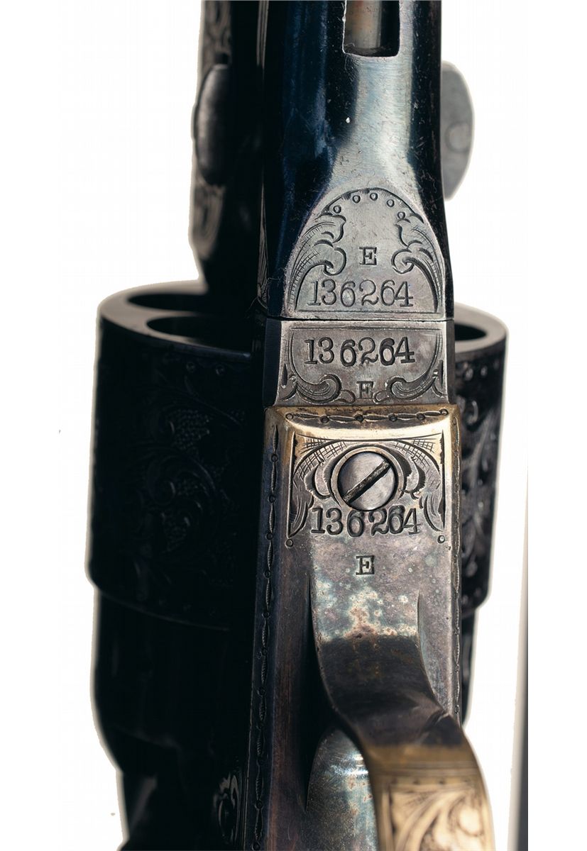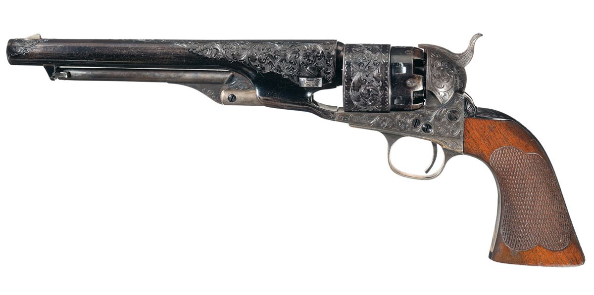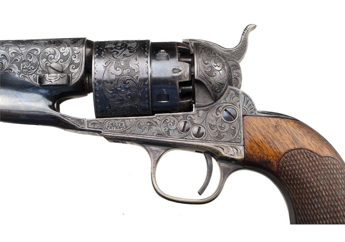 Engraved Colt Model 1860 Army Revolver manufactured in 1863. The revolver has a small "E" stamped next to the serial number on the barrel, frame, trigger guard and blackstrap. The barrel, frame, trigger guard and back strap are engraved with Germanic style scroll work on a punch-dot background. The hammer is engraved with a wolf's head motif. The engraving coverage approximates what Colt later designated level "A" engraving. The top of the barrel is marked with the U.S. America address with "COLTS/PATENT" on the left side of the frame. "Crown/V" and "P" proofs are stamped on the left side of the barrel ahead of the wedge and alternating on each cylinder chamber. The full serial number "136264" is stamped on the bottom of the barrel lug, frame, trigger guard and backstrap, with the partial number "6264" on the wedge and arbor pin.