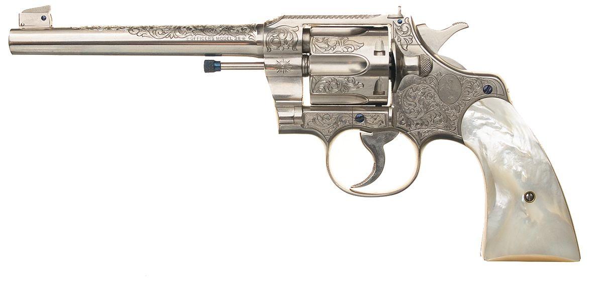 Manufactured in 1932. In addition to the standard markings, the revolver is decorated with floral scroll and punch dot engraving on the barrel, frame, top strap and cylinder flats. All nickel finish with niter blue screws and ejector head, and fitted with smooth pearl grips.