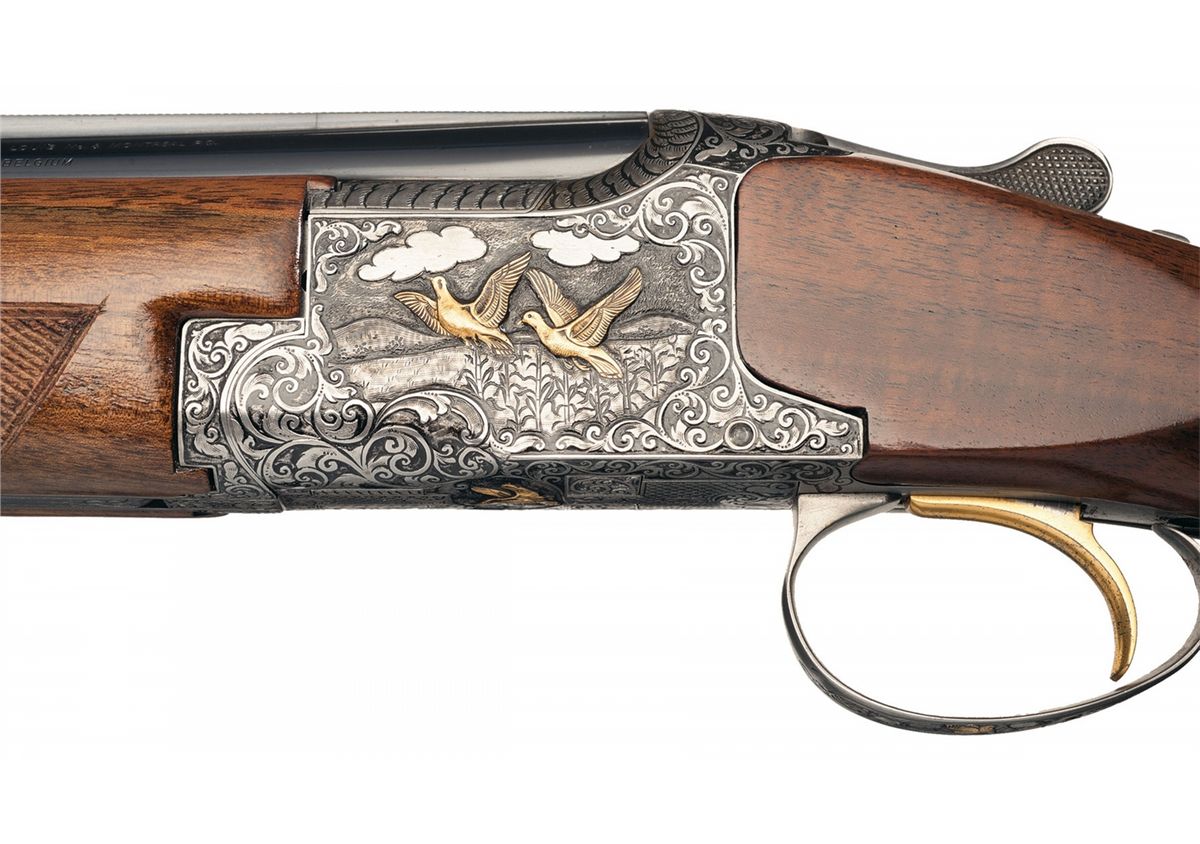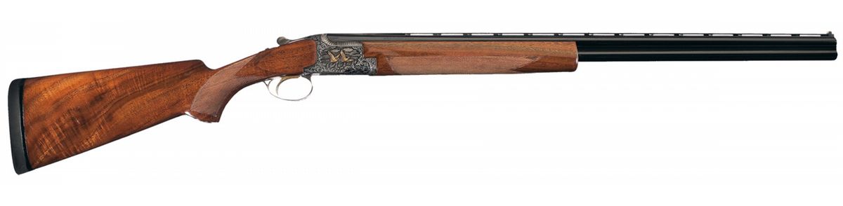 Manufactured in Belgium. Dual ivory bead sights on the vent rib. Choked skeet/skeet, 2 3/4 inch chambers with ejectors. The receiver, trigger guard and takedown lever are custom scroll engraved. Engraved and gold inlaid scenes of two pigeons in flight in field scenes on the right and left side of the receiver, a single flying pigeon on the underside with a wood cock on the trigger guard. Gold plated trigger. Replacement checkered walnut forearm with engraved forearm hardware, pistol grip stock with a gold medallion grip cap engraved "M" and a solid "Old English" Pachmayr recoil pad. Length of pull is 14 3/4 inches.