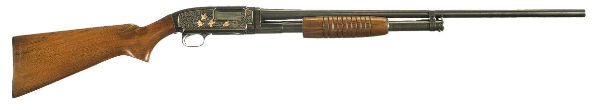 Made in 1957. Single nickel bead sight, full choke and 2 3/4" chamber. Custom engraved and inlaid, with scenes of pheasants and quail. Smooth pistol grip stock with grooved forearm and Winchester buttplate. Length of pull 14".