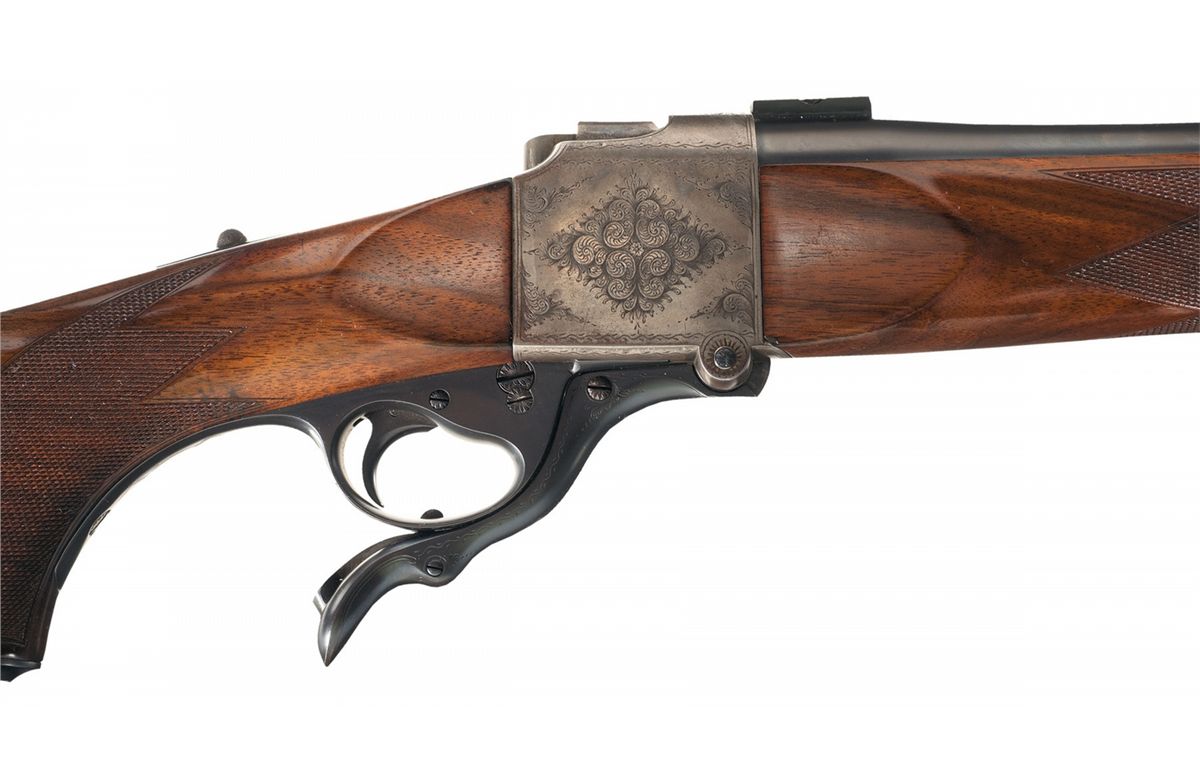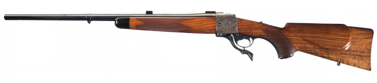 The top of the barrel is engraved "No1868 GRIFFIN & HOWE INC. NEW YORK", has a sling barrel band base near the center and has two scope target blocks mounted towards the breech end. The receiver and lever have nicely executed floral scroll engraving. There is a top tang safety with gold highlighted "SAFE" marking. Appears to be chambered for a bottleneck .25 cartridge round. Mounted on a nice straight grain walnut multi-point checkered forearm with ebony forend and pistol grip stock with raised cheekpiece, steel grip cap, silver initial oval, rear sling stud and checkered steel buttplate.