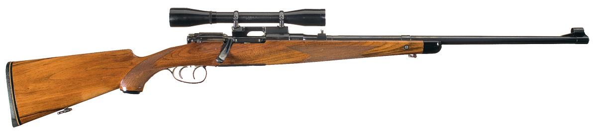 Hooded ramp front and two leaf rear sights, with a Leupold Pioneer 4X scope with Leupold mount. Scroll engraved action with deep relief engraved game scenes on the floor plate and trigger guard. Checkered pistol grip stock with grip cap, black forend cap, sling swivels, cheekpiece and solid Pachmayr recoil pad.
