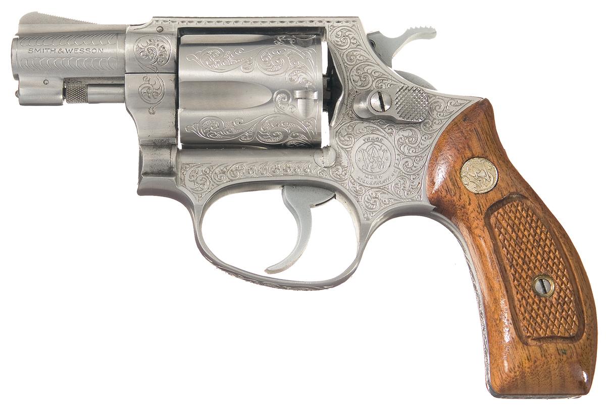 Manufactured from 1970-1973. Standard barrel and frame markings with 95% of the metal surfaces featuring scroll engraving on a punch dot background with a band of floral leaf engraving around the rear of the cylinder. Fitted with S&W medallion checkered grips.
