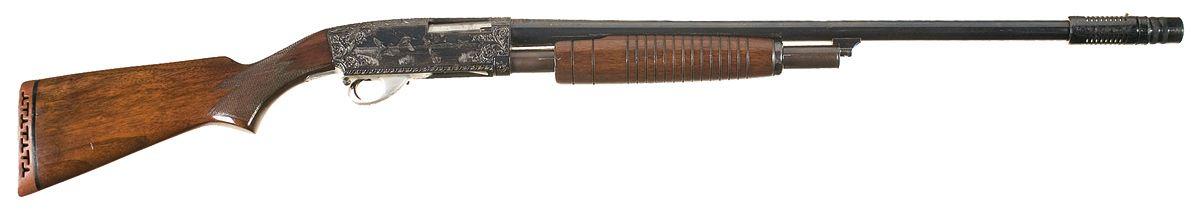 Standard features, the breech end of the barrel and the receiver shows floral scroll engraving with each side of the receiver engraved with game scenes and initials on the trigger guard. The slide handle has 1" crack on the right side. 2 3/4" chamber, Savage super-choke and a 14" length of pull.