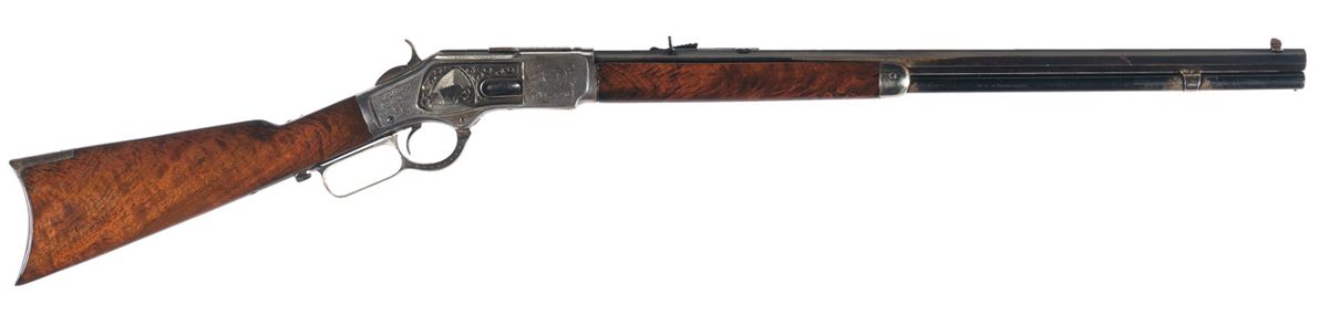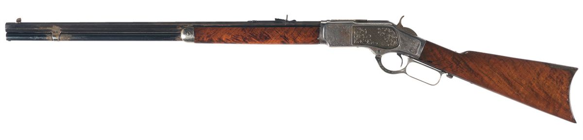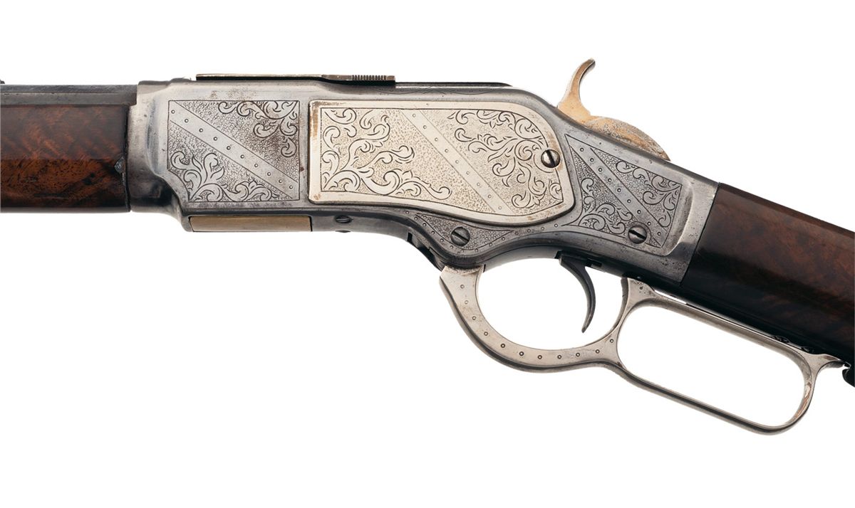 Floral scroll and punch dot engraved receiver. Receiver, hammer, lever, forend cap and magazine band silver plated.