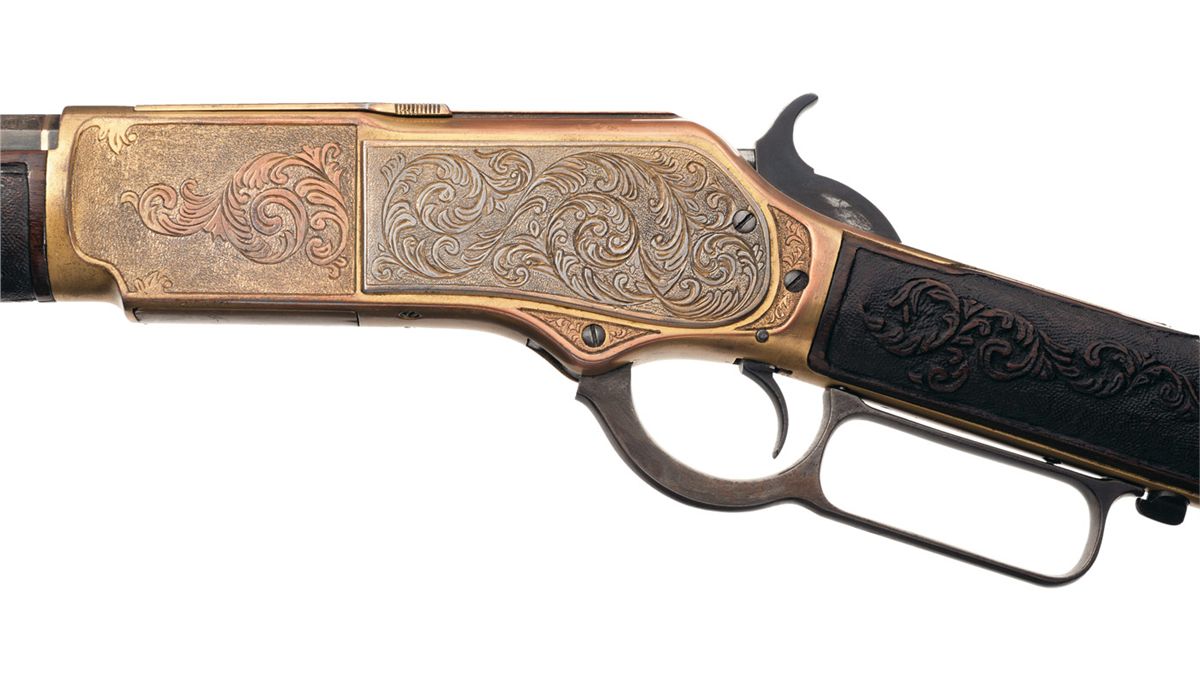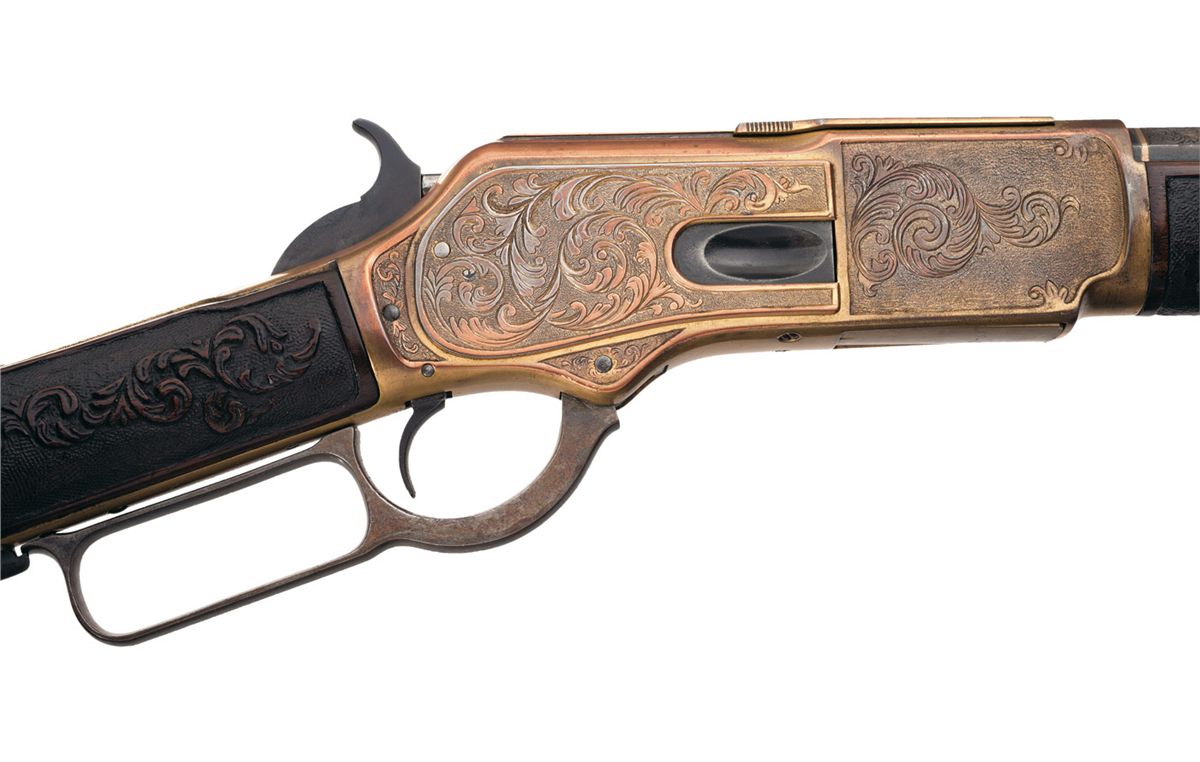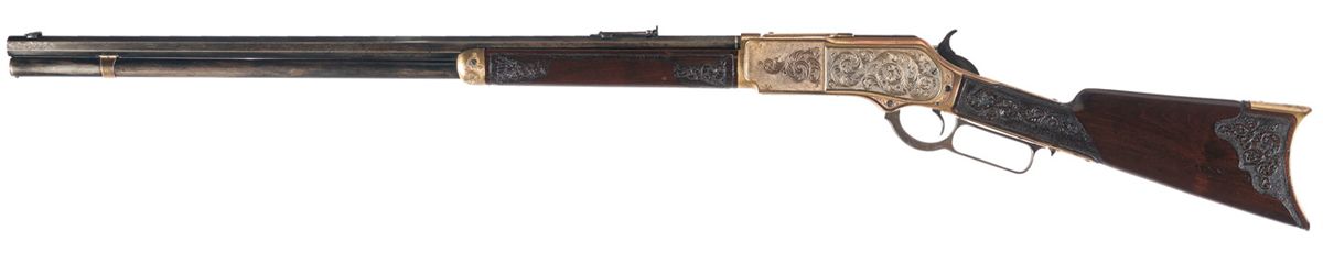 Gold plated receiver, forearm cap and magazine band. Floral scroll engraved receiver, wdeges on the breech and muzzle ends of the barrel, forend cap and buttplate tang with a matte background. Forearm and stock have floral scroll carving with a matte background.