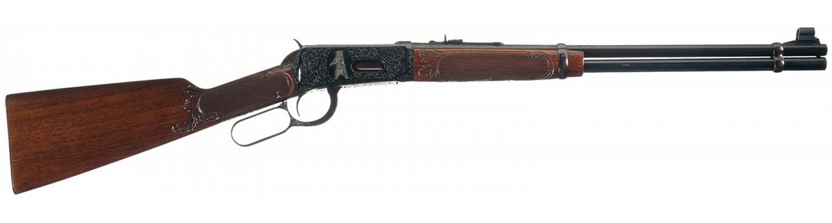 Manufactured in 1953. This carbine features floral scroll engraving with a punch dot background on the top rear half of the barrel, top of the bolt, tangs, receiver, lever and lever assembly plate. In addition there is a wooded mountain scene with two running silver inlaid relief deer on the left side of the receiver and a silver inlaid relief standing grizzly bear on the right side. The left rear of the barrel has the standard markings and the serial number is marked on the front bottom of the frame. Standard hooded ramped blade front sight and adjustable rear sporting sight, all blue finish and mounted with a walnut forearm with floral carved bordered checkering and straight grip stock with the same floral carved bordered checkering on the wrist and a big horn ram in a mountain scene on the left side of the stock.