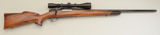 Custom FN Mauser rifle by Mathews Gunsmithing of Downey. #2632 (underneath), 7mm Rem Mag, Douglas Supreme BBL, adjustable trigger, Leopold scope, fine handmade stock with milled steel butt plate. Famous S.C. Gunsmith made early 1980's. Est.:$500-$1,000.